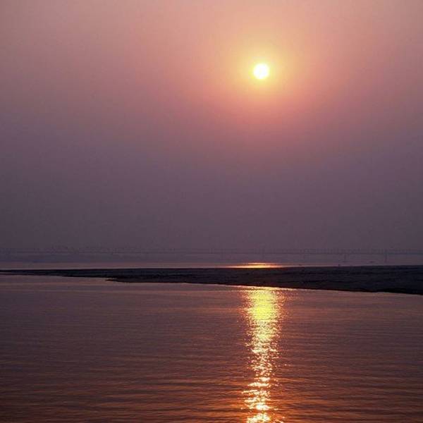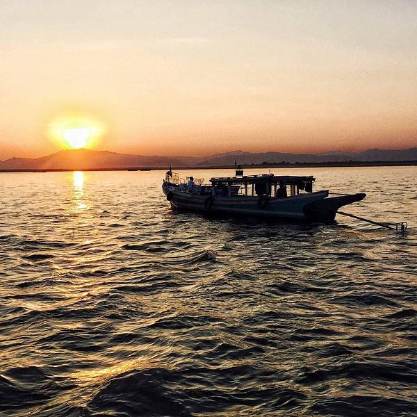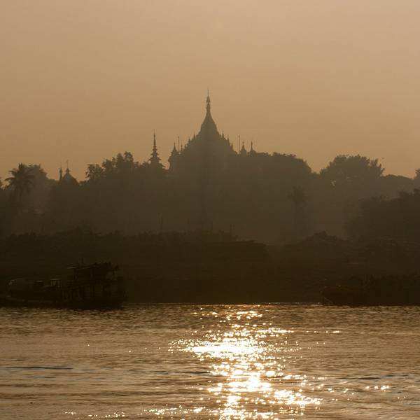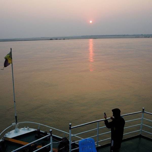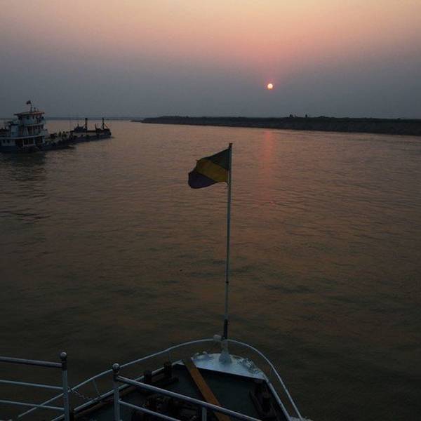 坐船从曼德勒到蒲甘。太阳从佛塔后面升起,伊洛瓦底江在脚下翻滚。