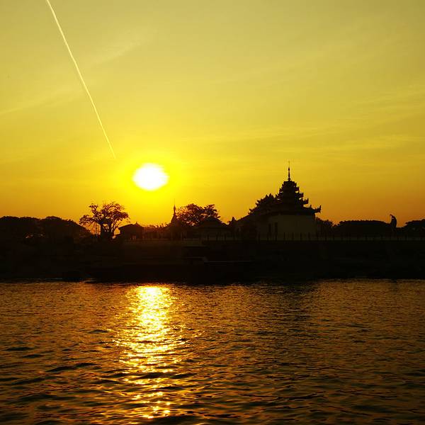 伊洛瓦底江上的一抹金黄,美不胜收;相机拍出来,惨惨淡淡,不够浓郁。下山已是七点了,找到师傅,托师傅带我们去超市,才知道大超市就在大皇宫不远处,我们昨日完全走反了了方向。