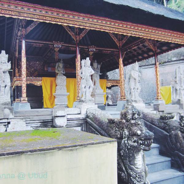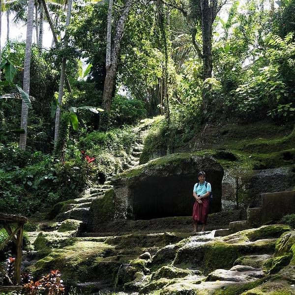 下台阶途中的美景。据说,这些石雕是为了纪念巴厘岛最为古老的王室成员,国王,王后,嫔妃,大臣等等这里是巴厘岛最大且最古老的遗迹了。进门后,穿上纱笼,往山下走了270级的台阶。