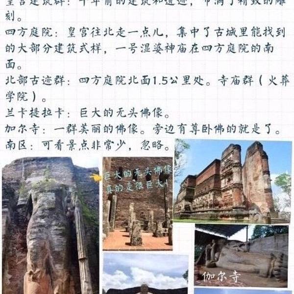 波隆纳鲁沃古城:不比吴哥窟有那么多的名胜古迹,奇形怪石,波隆纳鲁沃古城以寺庙遗址为主,与泰国的...波隆纳鲁沃古城:不比吴哥窟有那么多的名胜古迹,奇形怪石,波隆纳鲁沃古城以寺庙遗址为主,与泰国的大城相得益彰。老外喜欢租一辆自行车(400卢比/天辆),享受阳光,挥洒汗水,懒人可以包一辆tutu车(8000卢比/...波隆纳鲁沃古城:不比吴哥窟有那么多的名胜古迹,奇形怪石,波隆纳鲁沃古城以寺庙遗址为主,与泰国的大城相得益彰。老外喜欢租一辆自行车(400卢比/天辆),享受阳光,挥洒汗水,懒人可以包一辆tutu车(8000卢比/天,含逃票,没看错,是逃票,娃哈哈)。