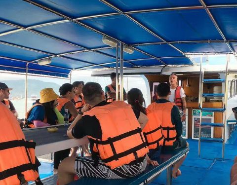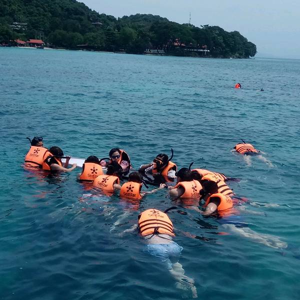 解说海上和上岛注意事项后,大家开始挑选装备,船上提供浮潜面罩,呼吸器,其他的可根据自己情况选择...接送车辆早上7:30准时来都大厅接我们,一路上遇到的都是前往皇家码头出海的人。路上全是丰田车,一车连司机共13人。到达码头游船公司还给大家提供了饼干,三明治,牛奶,咖啡各类早餐。