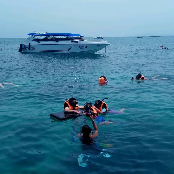 解说海上和上岛注意事项后,大家开始挑选装备,船上提供浮潜面罩,呼吸器,其他的可根据自己情况选择沙滩袜子200铢(价格和某宝差不多,底子比某宝同价位的厚些),脚蹼150铢,租潜水相机1500铢左右吧。