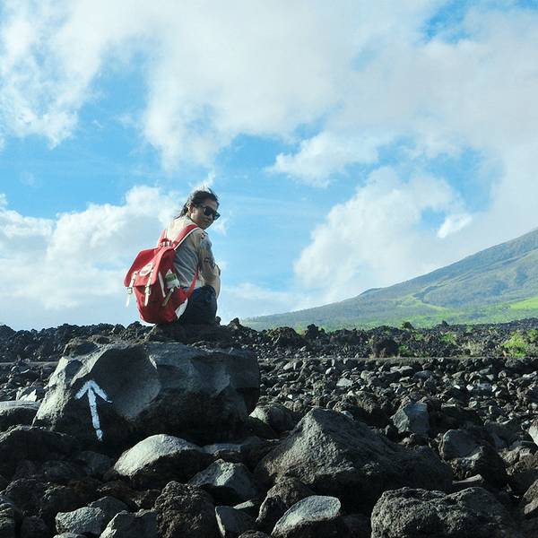 骑着摩托,一路向西,大概距离市中心40分钟的距离,到达山脚下的小村庄,再徒步到达。沿着山下冲刷而成的河床一直向前,河床上不时有当地人筛选火山石运回修建房屋,向导解释说,火山灰建的房屋冬暖夏凉,很是舒适。人类与无法预测的自然,人就是自然的臣民,有敬畏有回馈,若是冒犯,就喷给你看。