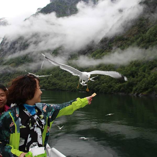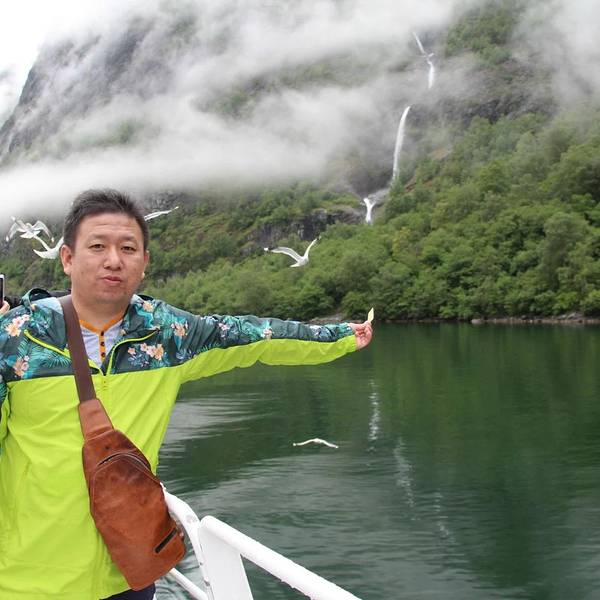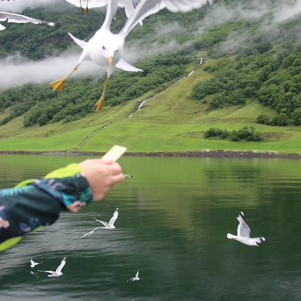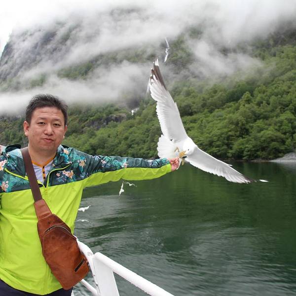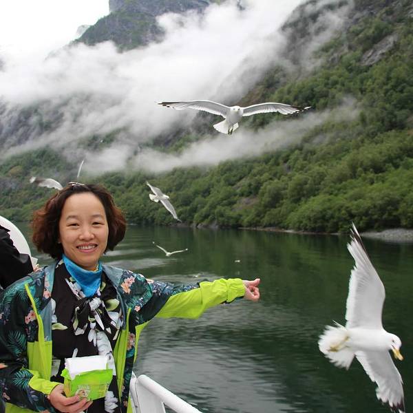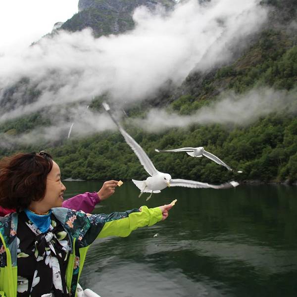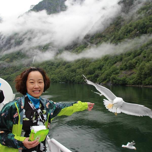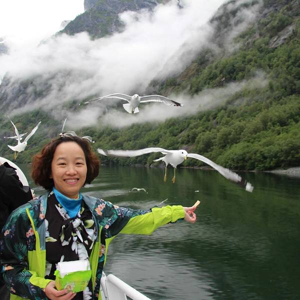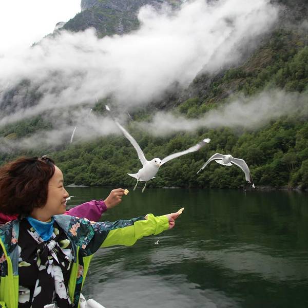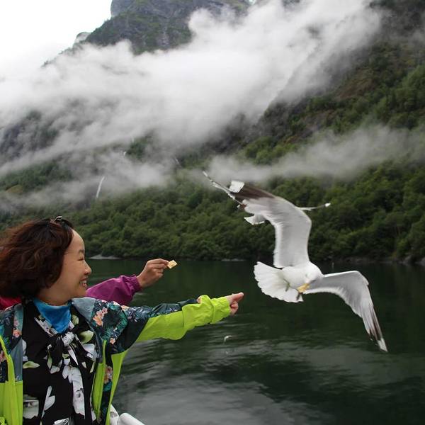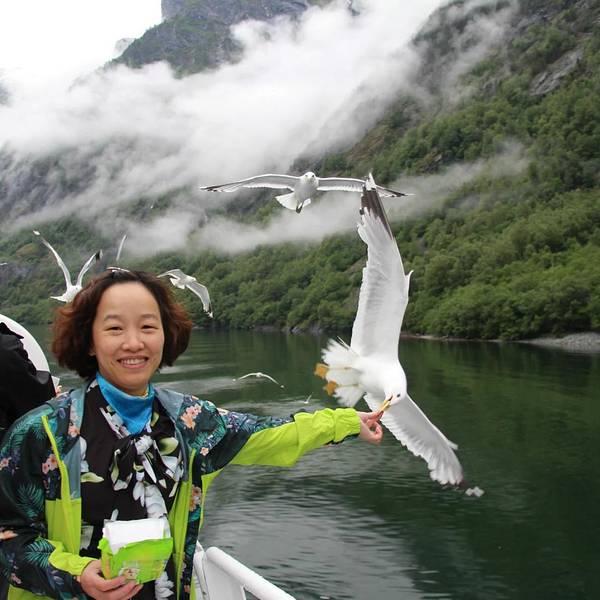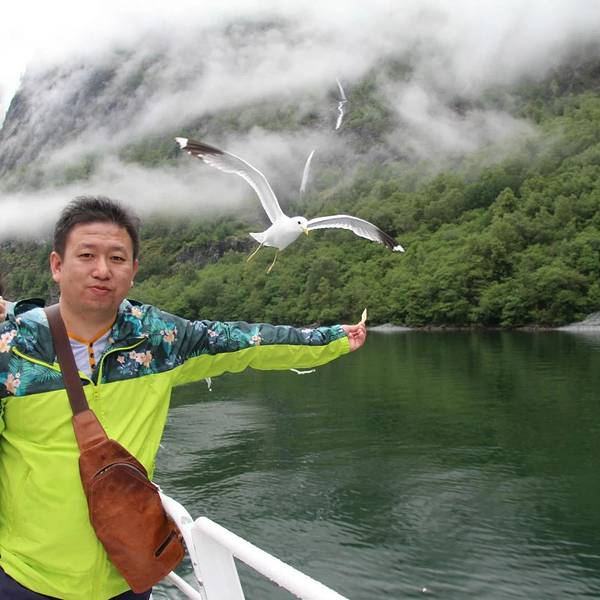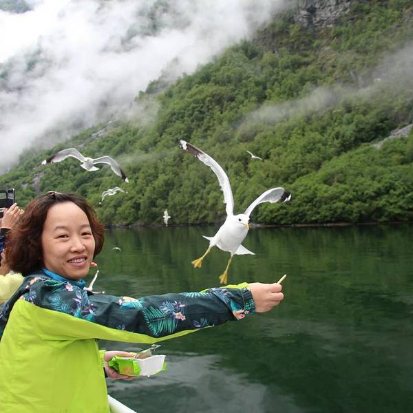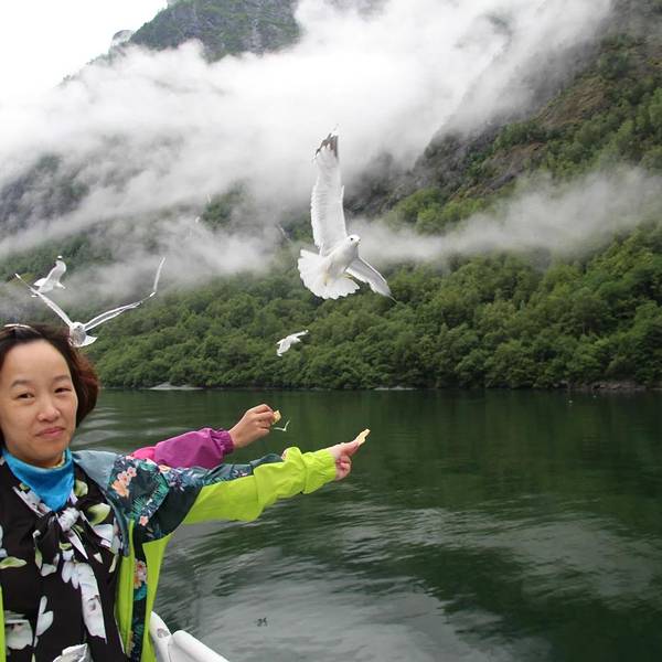 我真的很羡慕:他们可以在喜欢的地方停下来,将自然风景尽收眼底,也可以拿出相机记录下挪威的美,和...下了车,我们要乘坐峡湾游船(自费项目,70欧元,2小时)。领队告诉我们,峡湾是连着海的,那里飞着成群的海鸥,那些海鸥会跟在游船后面,等你喂它们;运气再好一点,可以看到海豚跃出水面;如果运气极好,说不定可...下了车,我们要乘坐峡湾游船(自费项目,70欧元,2小时)。领队告诉我们,峡湾是连着海的,那里飞着成群的海鸥,那些海鸥会跟在游船后面,等你喂它们;运气再好一点,可以看到海豚跃出水面;如果运气极好,说不定可以看到鲸鱼。在挪威,天气状况比较难以预测。但是不同的天气可以凸显出峡湾不同的美。游船开启,那些海鸥真的跟在我们后面。我拿出一包饼干,学着其他游客的样子举在手里,海鸥果然靠近我,然后从我手中啄去饼干。两边是高耸的山,云依然低低地环在山峰,若干细小的瀑布从山间倾泻而下,空气好清新。游览过半,雨又下下来了,雨滴打在船上,打在人们身上。大部分人都选择了回舱避雨,可我一点也不在意,因为雨中的峡湾也是那么美,朦胧中有一种神秘感。雨,把本来就清新的空气洗得更加湿润,清凉。闭上眼睛,深深地呼吸,感觉到雨滴在细语,峡湾的每一处景物都在轻轻舞动。云几乎一直飘浮在我们身边,它们颜色淡淡的,近乎透明。之所以不称它为雾,是因为它们还保持着云应有的姿态。回程途中,我妄图用相机记录下沿途的风光,可是我和相机怎么也不能表现出峡湾的美。看着停在路边的自驾游者,我真的很羡慕:他们可以在喜欢的地方停下来,将自然风景尽收眼底,也可以拿出相机记录下挪威的美,和家人分享。可是我却只能徒劳地按下快门,然后对着晚一秒拍下来的照片捶胸顿足。 展开