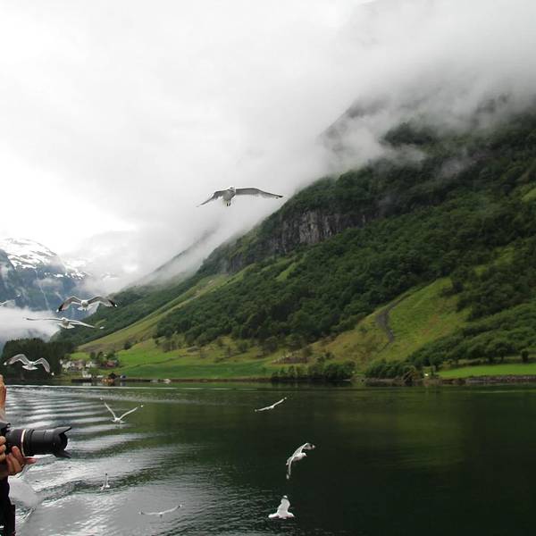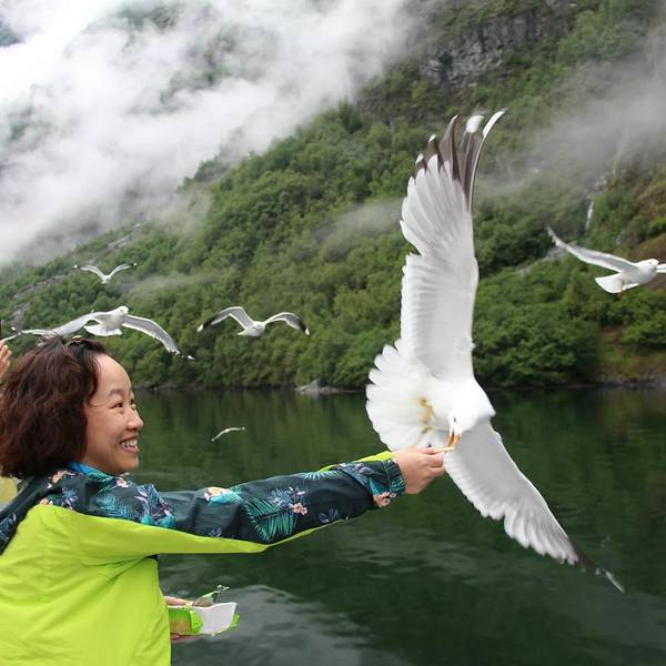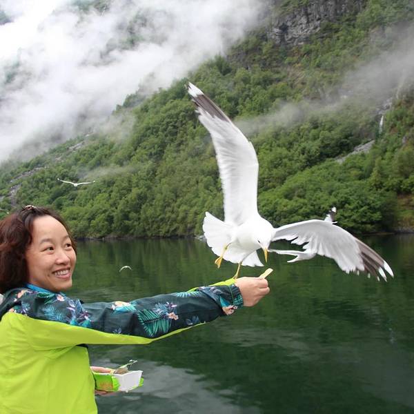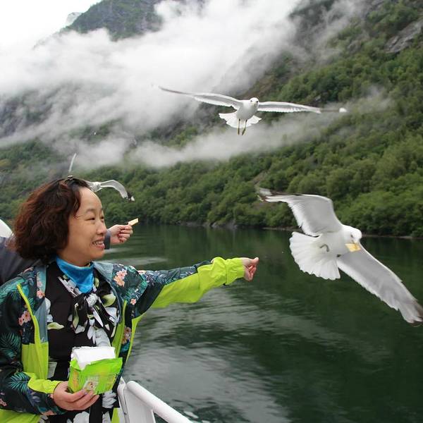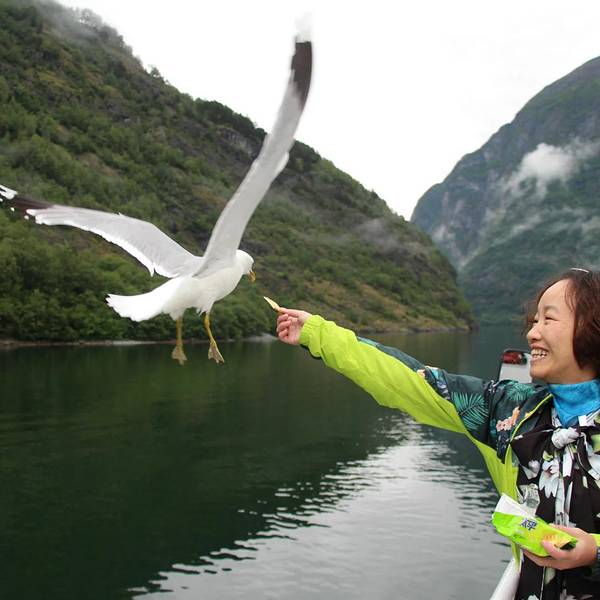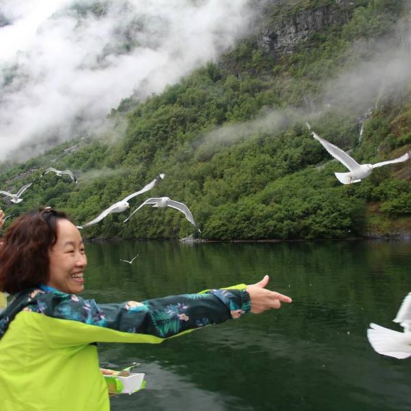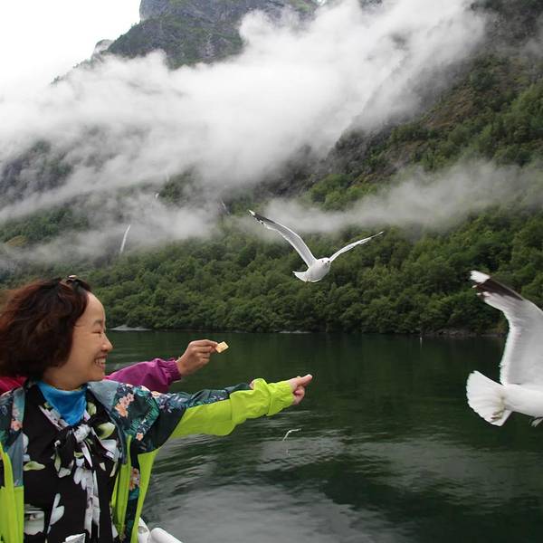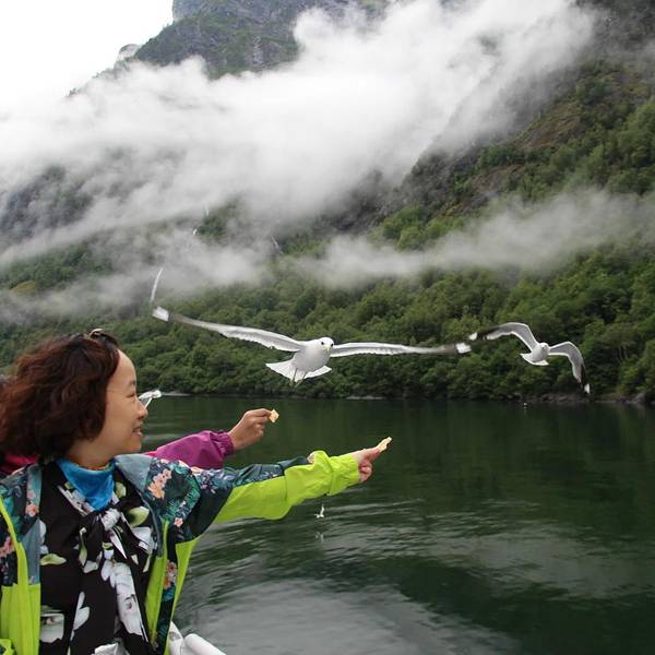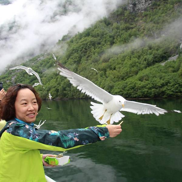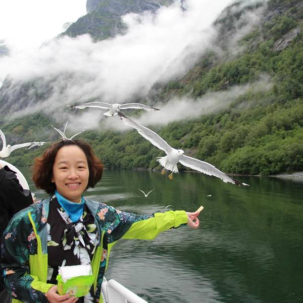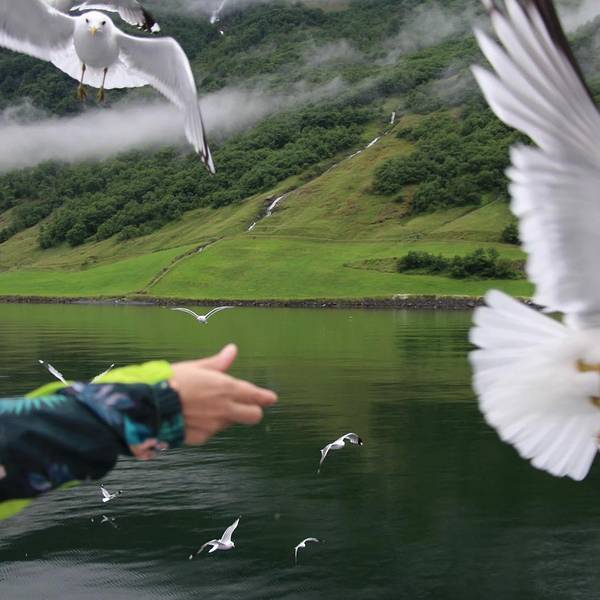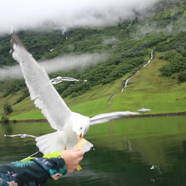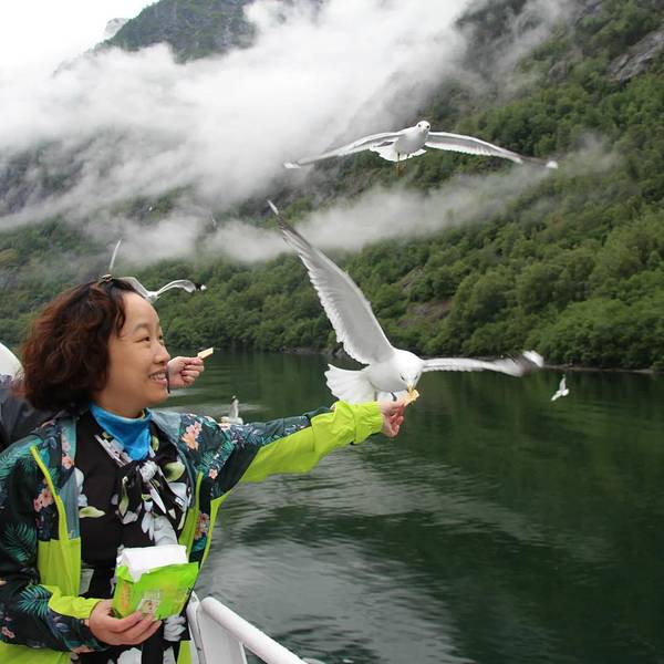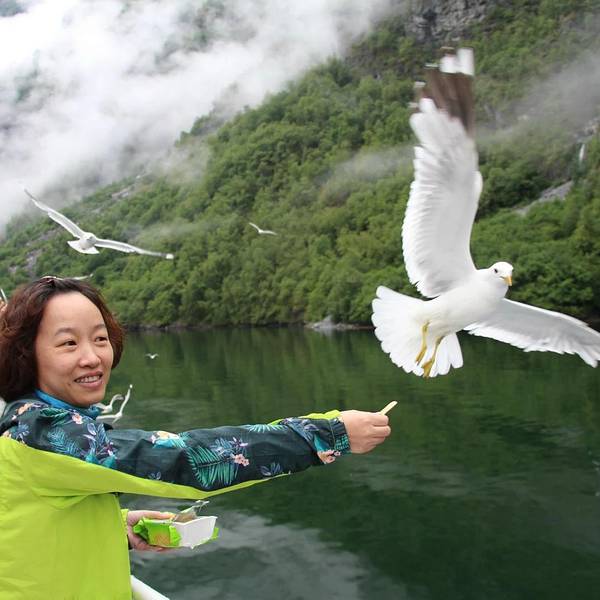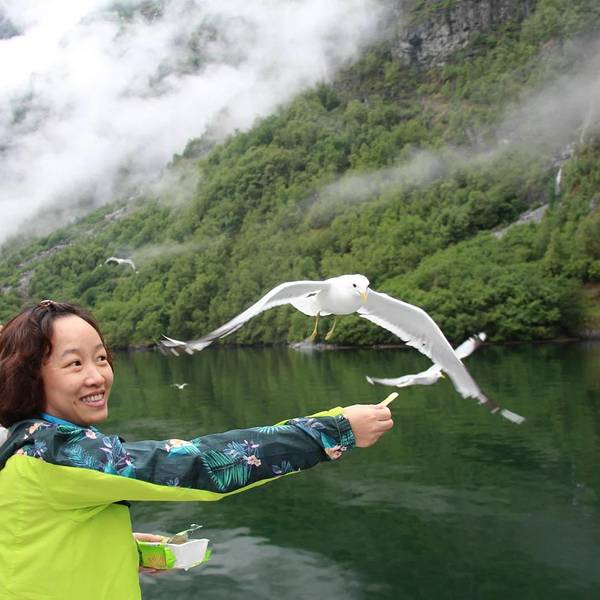 我真的很羡慕:他们可以在喜欢的地方停下来,将自然风景尽收眼底,也可以拿出相机记录下挪威的美,和...下了车,我们要乘坐峡湾游船(自费项目,70欧元,2小时)。领队告诉我们,峡湾是连着海的,那里飞着成群的海鸥,那些海鸥会跟在游船后面,等你喂它们;运气再好一点,可以看到海豚跃出水面;如果运气极好,说不定可...下了车,我们要乘坐峡湾游船(自费项目,70欧元,2小时)。领队告诉我们,峡湾是连着海的,那里飞着成群的海鸥,那些海鸥会跟在游船后面,等你喂它们;运气再好一点,可以看到海豚跃出水面;如果运气极好,说不定可以看到鲸鱼。在挪威,天气状况比较难以预测。但是不同的天气可以凸显出峡湾不同的美。游船开启,那些海鸥真的跟在我们后面。我拿出一包饼干,学着其他游客的样子举在手里,海鸥果然靠近我,然后从我手中啄去饼干。两边是高耸的山,云依然低低地环在山峰,若干细小的瀑布从山间倾泻而下,空气好清新。游览过半,雨又下下来了,雨滴打在船上,打在人们身上。大部分人都选择了回舱避雨,可我一点也不在意,因为雨中的峡湾也是那么美,朦胧中有一种神秘感。雨,把本来就清新的空气洗得更加湿润,清凉。闭上眼睛,深深地呼吸,感觉到雨滴在细语,峡湾的每一处景物都在轻轻舞动。云几乎一直飘浮在我们身边,它们颜色淡淡的,近乎透明。之所以不称它为雾,是因为它们还保持着云应有的姿态。回程途中,我妄图用相机记录下沿途的风光,可是我和相机怎么也不能表现出峡湾的美。看着停在路边的自驾游者,我真的很羡慕:他们可以在喜欢的地方停下来,将自然风景尽收眼底,也可以拿出相机记录下挪威的美,和家人分享。可是我却只能徒劳地按下快门,然后对着晚一秒拍下来的照片捶胸顿足。 展开