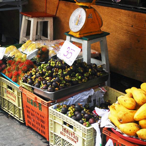 松撇市场(somphet market),门口虽不起眼,里面什么东西都有,特产啊,水果啊,鲜榨果汁啊。水果真的便宜,20个山竹才50B(10元人民币),榴莲一大盒150B,我每天回酒店都在这里扫货,带回房间继续吃。我在泰国8天,天天都吃咖喱、冬阴功,不是辣的就是热毒的,全靠这些水果挽救我生命,哈哈,一直都没喉咙痛等疾病。