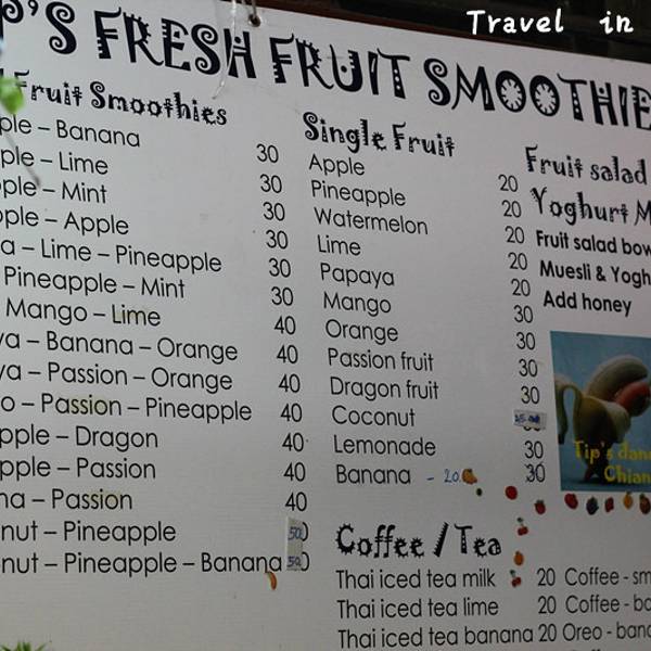 接着去了离塔佩门很近的松撇市场。买了红毛丹(25B/公斤)和莲雾(45B/公斤),水果真是太便宜了,还去市场里面吃了Fruit Smoothies和Fruit salad。好大一碗水果沙拉才50B,超大一杯芒果Smoothies才25B,味道和国内完全不一样,特别浓,而且没有加糖,纯粹的芒果味,黏黏的,吃惯了国内加太多水太多香精的沙冰,反而还真有些吃不惯这么原汁原味的。