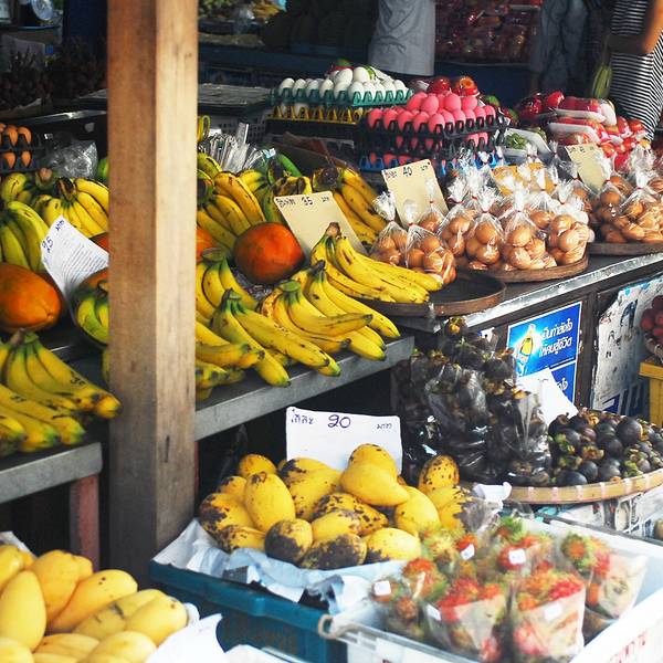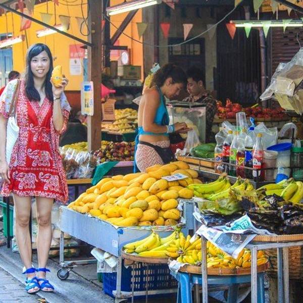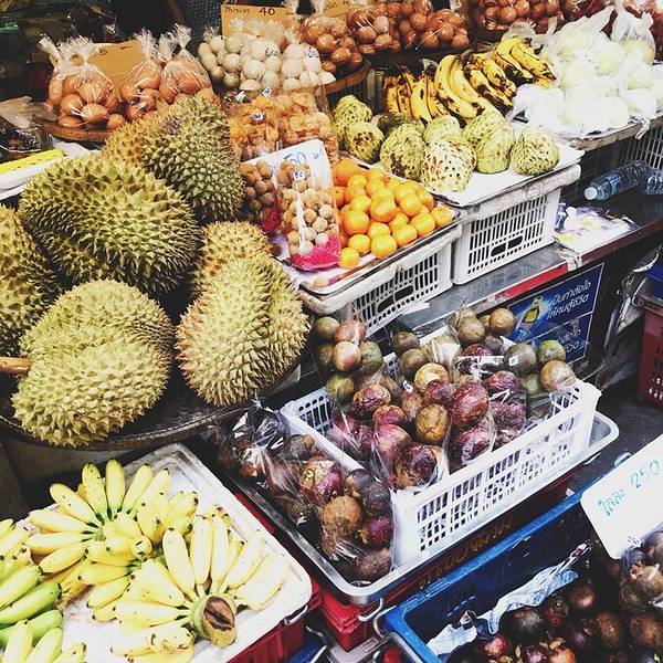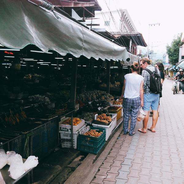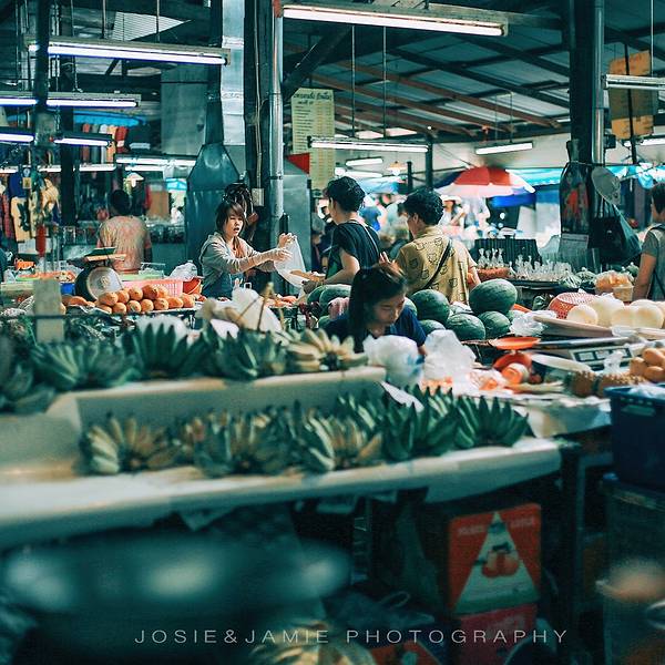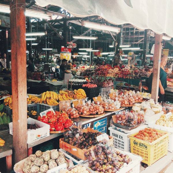 天慢慢黑了下来 休整完的我们准备出发逛吃逛吃 来得及想去当地的菜场 这个奇葩 不过去了之后我也觉得挺好 松撇市场 可以在网上直接找到名字导航 离我们酒店非常近这可能是我见过最干净的菜场了水果便宜的不要不要的 第一次过去是傍晚 可能老板都要收摊了 我买了一袋菠萝10铢 老板提着一小袋芒果用生硬的中文说 送~ 哈?愣了好吗 花了2块多人民币买了两包水果 人生观都颠覆了 彻底爱上这里