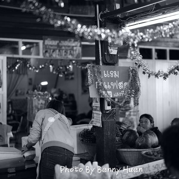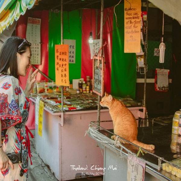 荡了一圈才发现,又回到了松撇市场。好吧,咱们来讲一讲这个特别的,我们来了三四次的当地市场吧!松撇市场,又有叫松佩市场(Somphet Market),离我们住的地方很近,步行五分钟。我记得妹尾河童先生在《河童杂记本》里曾谈过他在海外旅行的诀窍,其中有一点就是说要去当地市场逛一逛,“要了解那个国家啊,去那个国家老百姓日常卖东西的市场最好不过了”。 逛菜市场观看那里卖得蔬菜和鱼,能够真实鲜明地感受到那个国家人们的生活。“啊!这个国家的人吃这样的东西呀……是什么味道?”确实看到吃的东西不一样,甚至有些蔬菜水果都没看到过能深深感受到“啊,我终于没有在国内呀!”那种地域不同的感觉。所以,有机会就去当地集市和菜市场吧!这次好幸运的是有个这么近的菜市场在边上,虽然这个市场又小又挤,什么都卖。卖菜的边上竟然是家卖裤子的,大米铺旁则是卖泳衣的!不过,这个小小菜市场可是满足了我们对于水果的所有期盼。原本应该去古城外市郊的瓦洛洛市场的,但是因为门口小菜场就好便宜,一点没有因为他在古城内就胡乱涨价,一口气买了超多水果的两只对瓦洛洛再也没什么期待了!买的水果还因为吃不完跟着我们坐车到PAI县,还好一路都有小冰箱保鲜。看,超多水果,泰国芒果超好吃!松撇市场与我们也是超有缘的,走了几次都还是会路过它。昨天原本是准备抄小路去清曼寺参观完再回旅馆,但是竟然走错了路,绕着绕着还是绕到了松撇市场来,买了超多水果。所以,这次已经是第三次来市场了,但是却不是今天最后一次来市场哦!原来,我们一会儿要去的那个烹饪学校在开始学做泰菜前还有个去当地市场参观一项内容,而烹饪学校要领我们去的当地市场正是松撇市场呢!真是太巧了!阿婆烤的两个物体都有点诡异,红色那个长得像洋葱却不是洋葱,绿色那个和粽子似的却不是粽子。所以说,在国外菜市场总是能看到不认识的古怪东西,好奇心十足的海蒂总是想试试!遇到菜市场酱菜铺喵星人,和喵星人示好的K掌柜K掌柜,你吓到喵星人啦!你看人家都怕你了!