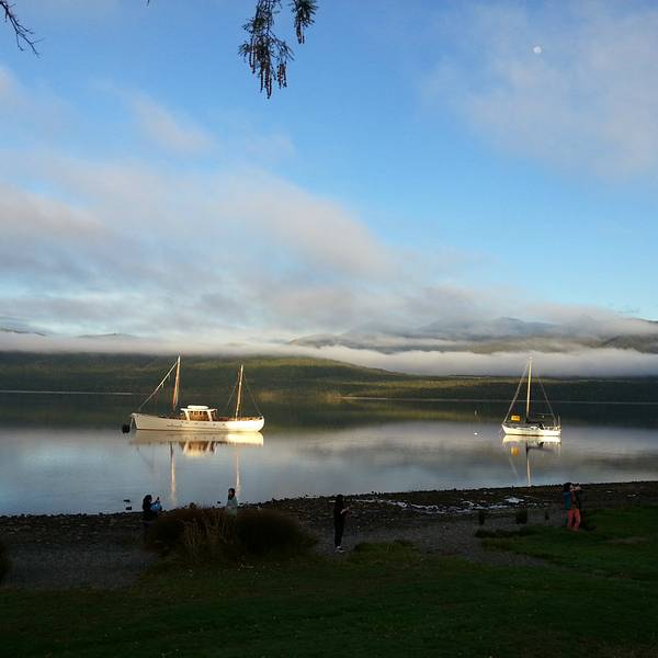回Te Anau的路上,天却又开始放晴了。连着几天住湖边,今天依旧是。前两天在葡萄酒庄园买的那瓶就终于有了用武之地,坐在房前拿上一杯小酒慢酌,聊聊人生看看美景发发呆,这才是我在旅行中最喜欢的时刻吧!此刻,我们俩谁也不想拿起相机,只想好好享受当下。未曾想,我们却成了别人眼中的景。一拿着相机的国人很有礼貌地走近问我们,可否帮我们拍张照,我们委婉地拒绝了。并非所有的景色所有的场景都需要用相机记录下来的吧!有时候,这一刻的感受也许用眼睛用心便已足够。