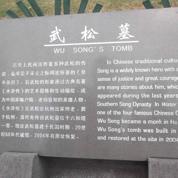 ...头都很近,20世纪初才修的墓,60年代被毁,这个是后来重建的,表达了人们对武松这个人物的怀念吧位于西冷桥头不远处,离苏小小墓和游船码头都很近,20世纪初才修的墓,60年代被毁,这个是后来重建的,表达了人们对武松这个人物的怀念吧。