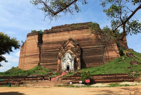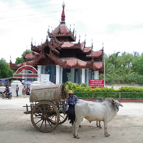 敏贡古城地处伊洛瓦底江右岸,在靠上游的地方,是一个很有趣的地方。曾经的繁华不再,如今它看起来更像是座不起眼的小乡村,尘土飞扬时才会令人想起那些曾经的辉煌和繁华。敏贡有一座雄伟壮观的佛塔——敏贡佛塔,是缅甸国王孟云为他的王后建造的一座未完成的皇宫,是世界上较大的砖制建筑之一。因工程浩大,在孟云王去世时历经11年,整个建筑却只完成了1/3。1838年,巨塔在一次地震中倒塌,现在留给人们的是一座巨大的塔基。佛塔地基北面不远处还有一座世界上很大的尚在使用的钟——敏贡大钟。高8米,直径5米,重90.55吨。这是世界上较大的一口未裂缝的钟。再向北行进200米就能看见有着波状台阶的白色欣毕梅佛塔,好似一个奶油大蛋糕,这也是为了纪念一位王后所造,据说这里是缅甸占星术占卜出的世界中心。