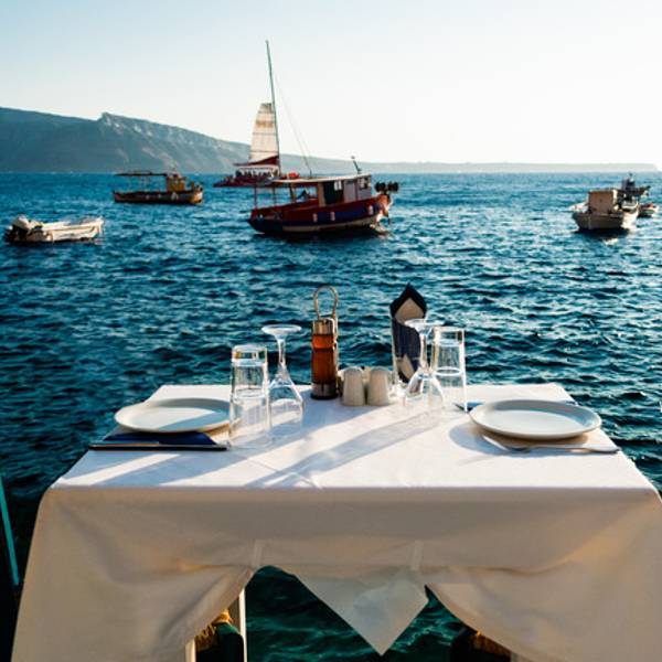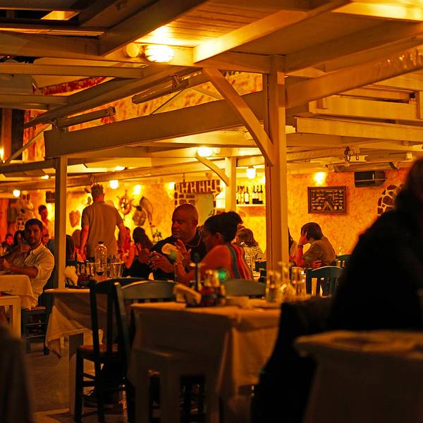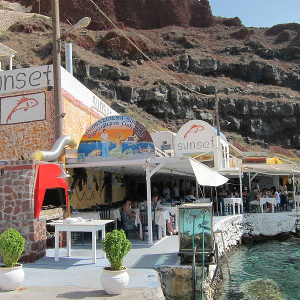 Sunset Tavern 位于Amoudi港湾,由一对渔民夫妇所开,同时也是绝佳的观日落地点。丈夫每天第一件事就是去海边捕鱼和海鲜,他们烹制的招牌菜龙虾意面不仅赢得了纽约时报美食频道的报道,也吸引了不少名人光顾。