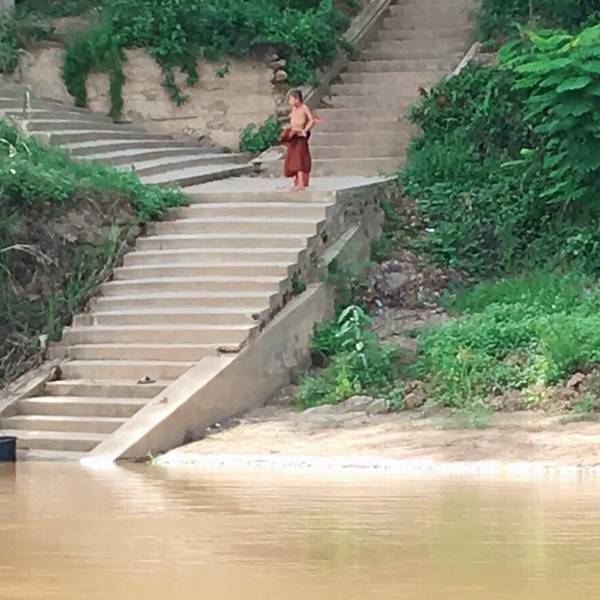停船上岸,参观一座古老的寺庙。河岸边鲜花盛开,蝴蝶纷飞,美不胜收停船上岸,参观一座古老的寺庙。河岸边鲜花盛开,蝴蝶纷飞,美不胜收。湄河开阔处,水面映着蓝天白云,令人心旷神怡。