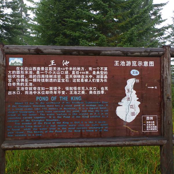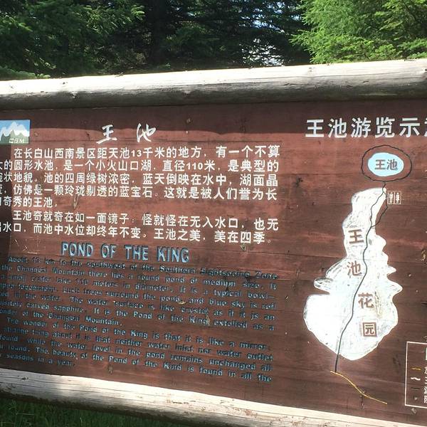 王池池面海拨1850米,面积约2000平方米。水质洁净,池畔长满乌拉草和蒲草,还有美丽的岳桦和塔松相伴。 池中有小鱼, 多青蛙、林中多鸟。清澈湖面上常常飘着 “呱—呱” 的蛙鸣和小鸟的“啾—啾”声。池水是蓝绿色,静谧得如同一面宝镜,映着天上的云、岸边的树。经常有成群的蜻蜓在湖面上飞舞。 关于王池名字的来源有一个小故事。据传,小罕子努尔哈赤在长白山挖人参时病倒,就是靠喝这池水才治好病,活了下来。努尔哈赤不忘池水救命之恩, 当他成了大器,统一了北方,重回长白山故地,看望池水。努尔哈赤说: “老百姓称我为老罕王,我应当称这救命的池水为王啊!”
