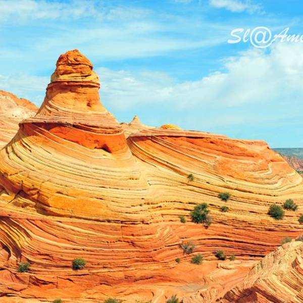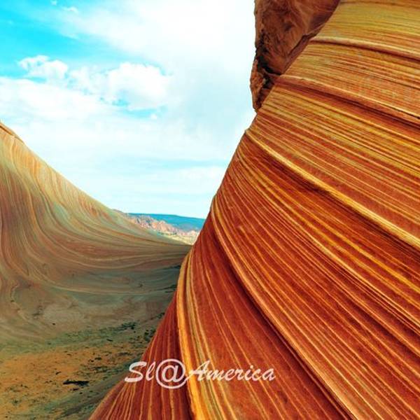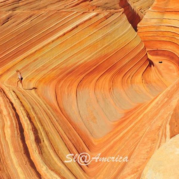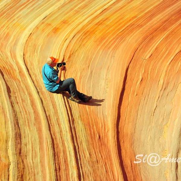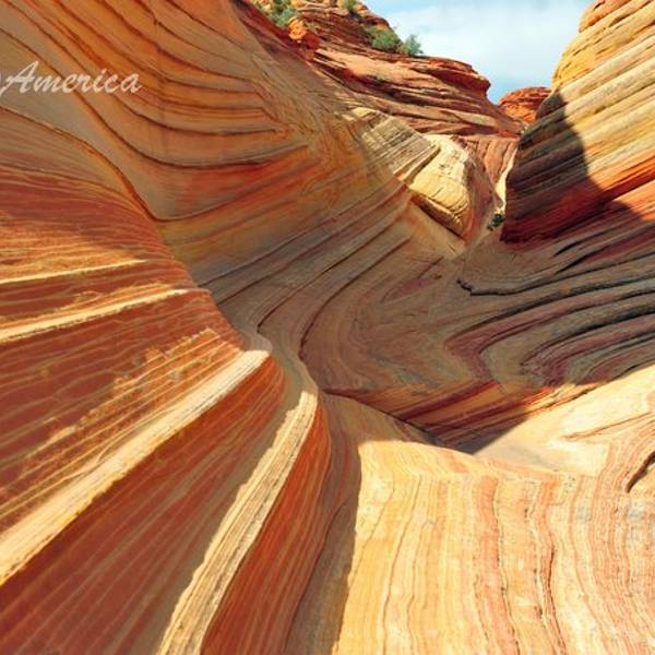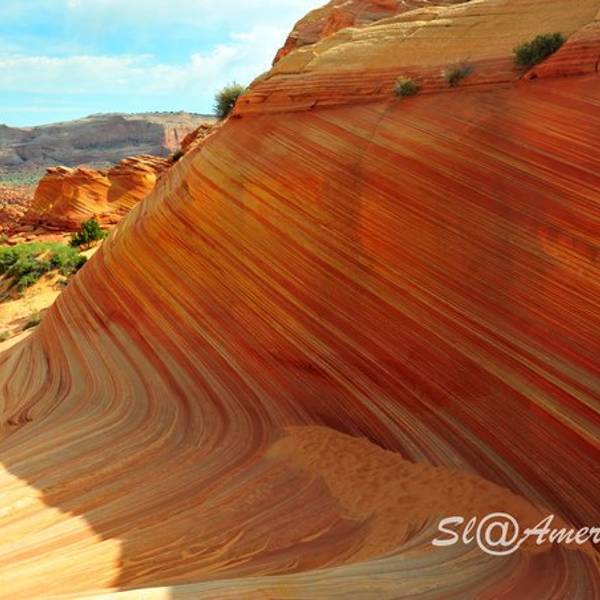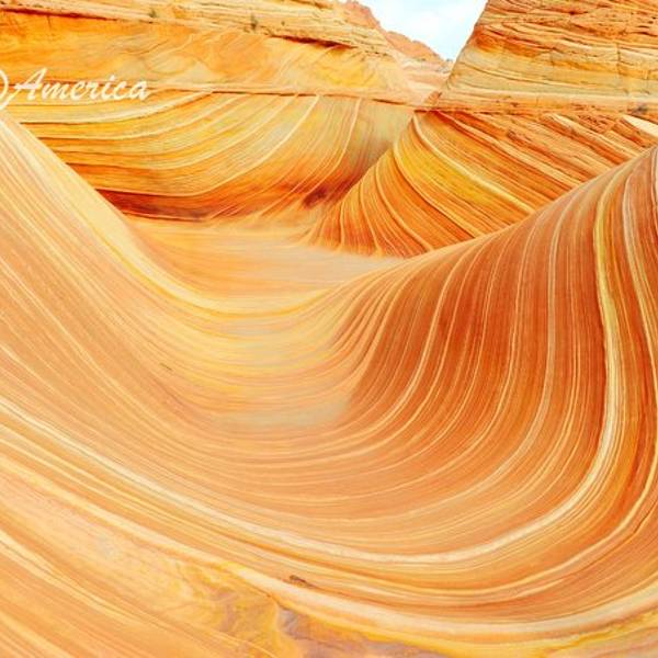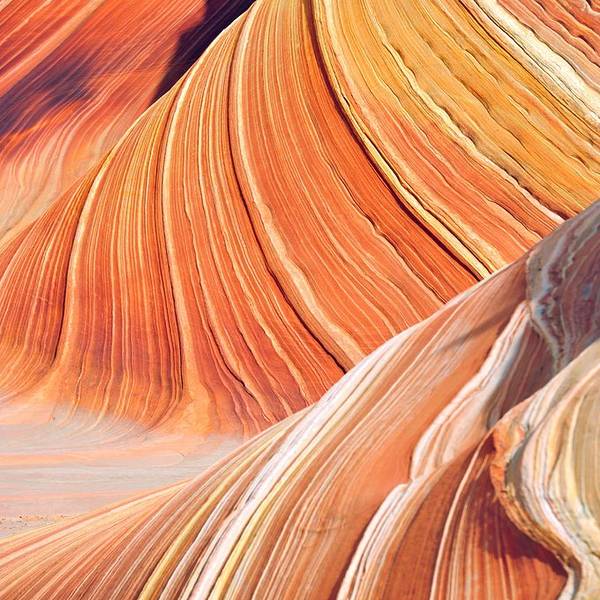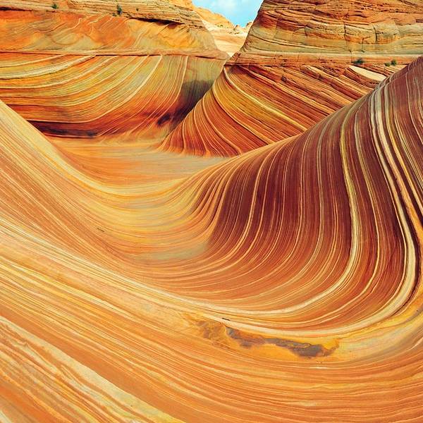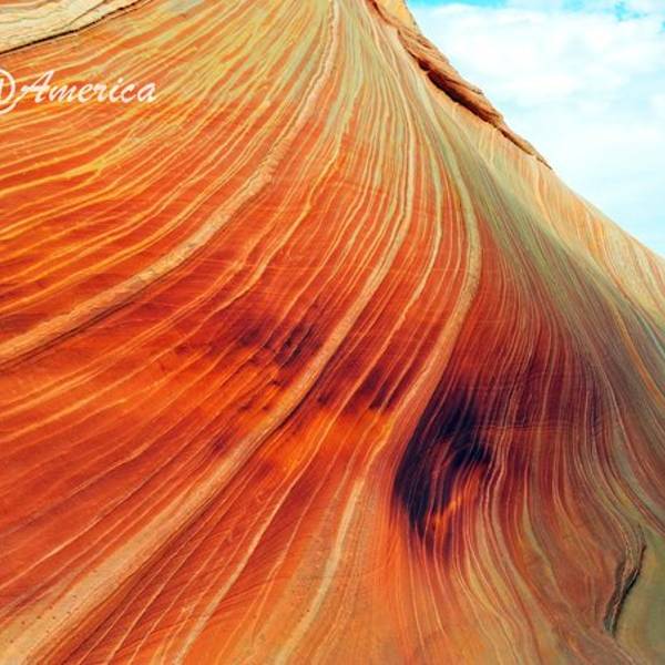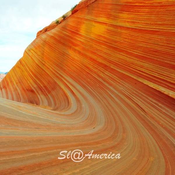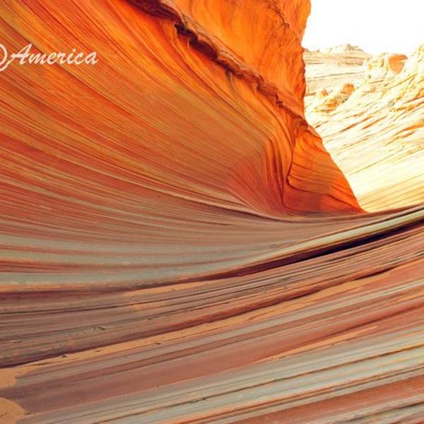 The wave,官方的名字应该叫做是Coyote Buttes North,中文很形象的称为波浪谷。它的形成是由数百万年的风、水和时间雕琢砂岩而成的奇妙世界。波浪谷岩石的复杂层面,是由一亿五千万前侏罗纪就开始沉积的巨大沙丘组成。在那个时候,这里的地貌好像沙漠一样,沙丘不断地被一层层浸渍了地下水的红纱所覆盖,天长日久,水中的矿物质把沙凝结成了砂岩,形成了层叠状的结构。这种古老的沙丘最后形成了被地理学家称为Navajo沙岩的地貌。后来,随着平原的上升,加上漫长的风蚀,水蚀,峡谷里砂岩的层次逐渐清晰地呈现出来。纤细的岩石纹路实际上是清楚地展示了沙丘沉积的运动过程。纹路的变化反映出每一层砂岩随着沉积矿物质的含量不同而产生的颜色深浅差异。红色主要是由铁和锰的氧化而产生,这些颜色不是一成不变的,往往在交错处和角落里形成更加复杂与抽象的图案。