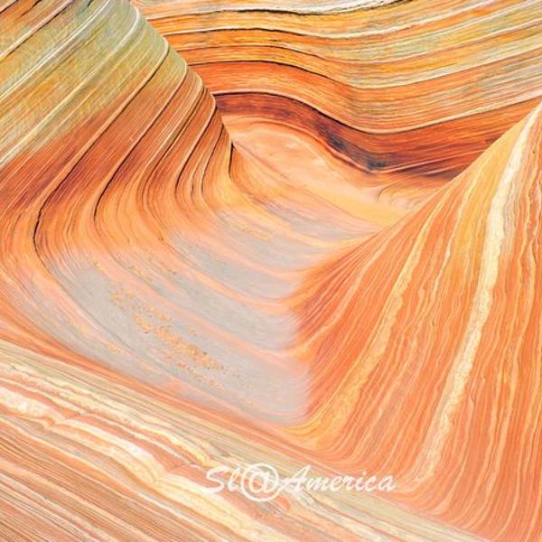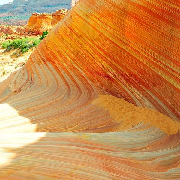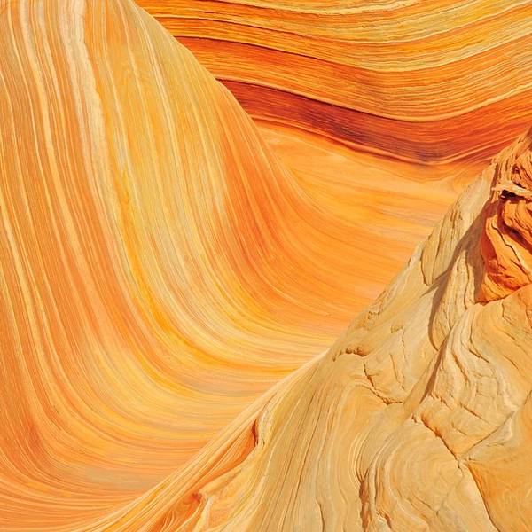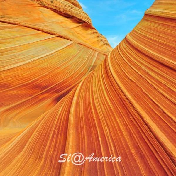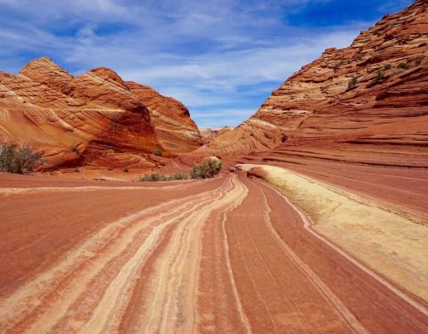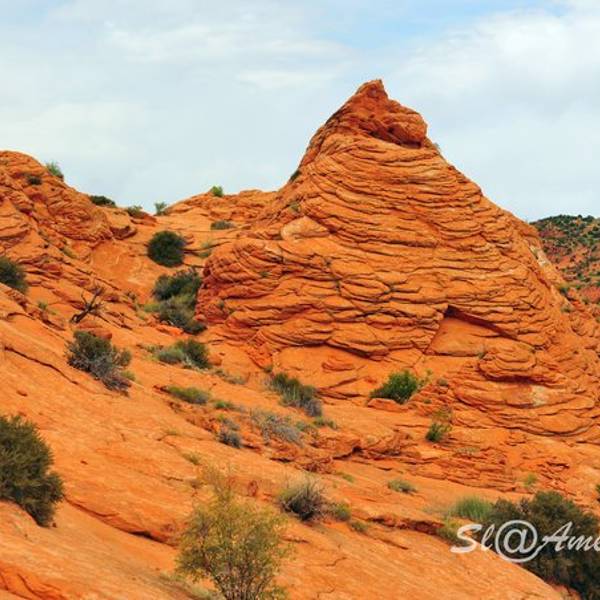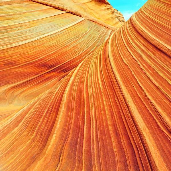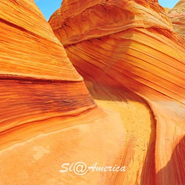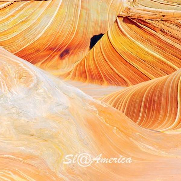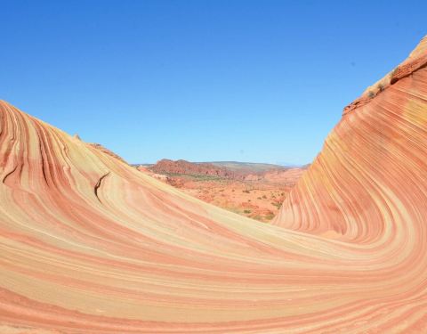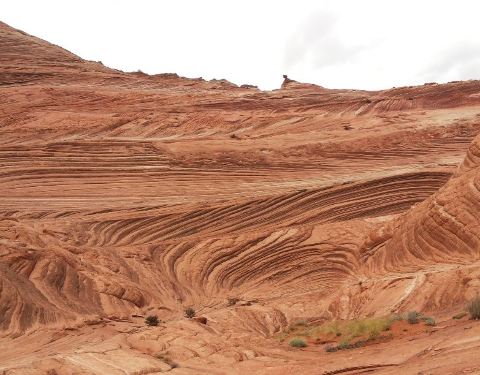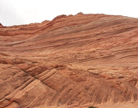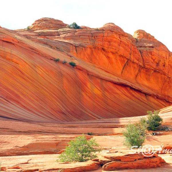 The wave,官方的名字应该叫做是Coyote Buttes North,中文很形象的称为波浪谷。它的形成是由数百万年的风、水和时间雕琢砂岩而成的奇妙世界。波浪谷岩石的复杂层面,是由一亿五千万前侏罗纪就开始沉积的巨大沙丘组成。在那个时候,这里的地貌好像沙漠一样,沙丘不断地被一层层浸渍了地下水的红纱所覆盖,天长日久,水中的矿物质把沙凝结成了砂岩,形成了层叠状的结构。这种古老的沙丘最后形成了被地理学家称为Navajo沙岩的地貌。后来,随着平原的上升,加上漫长的风蚀,水蚀,峡谷里砂岩的层次逐渐清晰地呈现出来。纤细的岩石纹路实际上是清楚地展示了沙丘沉积的运动过程。纹路的变化反映出每一层砂岩随着沉积矿物质的含量不同而产生的颜色深浅差异。红色主要是由铁和锰的氧化而产生,这些颜色不是一成不变的,往往在交错处和角落里形成更加复杂与抽象的图案。