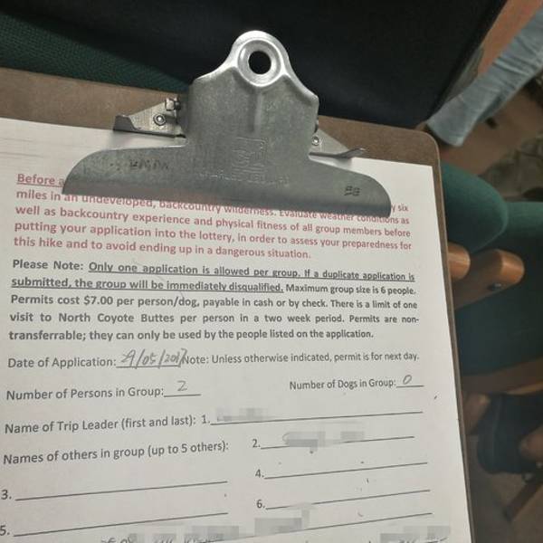 Walk-in permit的抽签地点在Kanab小镇,每天早上九点抽取第二天的十张票,九点是开始抽签的时间,之前还要填表等准备工作,所以建议提早十五分钟以上到。需要注意的是十一月中到三月中的时候,周六周日加上之后那个周一的30张许可证都是在周五同时抽的(法定假日除外)。