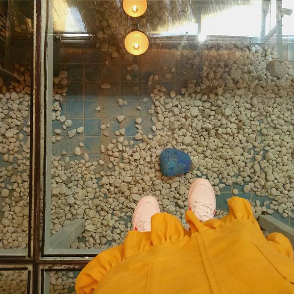玻璃上还放了一套餐桌椅,玻璃下面铺满了石子。下面那块被染成蓝色的石头比较耀眼。在玻璃路上走了两圈就出去了,旁边还有一个更大的展厅。