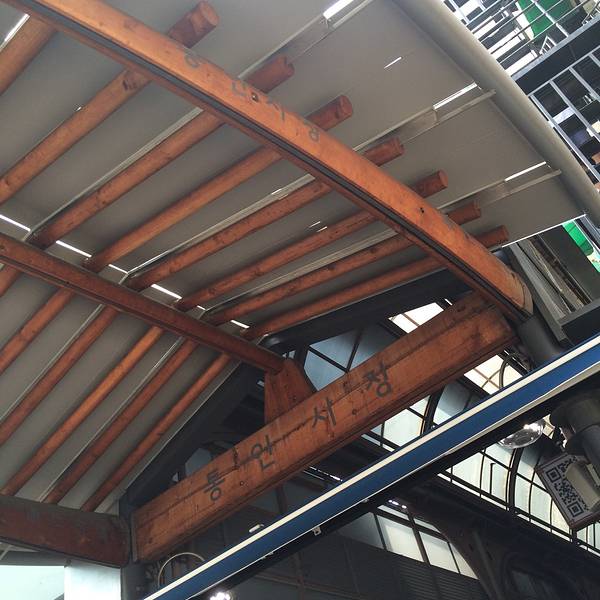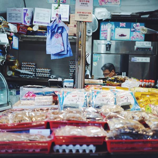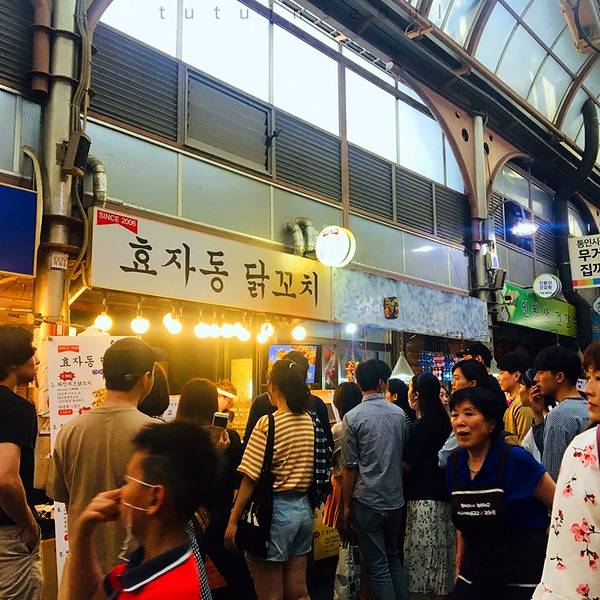 在 大悟 书店附近有一个传统市场——通仁市场。没错,不是那个耳熟能详的“广藏市场”,通仁市场最特别的地方在于,用铜钱套餐。你需要在特定时间内将韩元更换成铜钱并配有一个便当盒,再到各个摊位消费。当天去的时候,很多摊位已经打烊,一个在整理铜钱的姨母告知,特色便当营业时间:11点-17点。通仁市场通仁市场通仁市场人气火爆的“孝子洞鸡肉串”,下次去试试。通仁市场这类市场,除了卖一些炸物小吃外,还有蔬菜水果和日用杂货等。通仁市场路过的“通仁韩药馆”,光看门头外景,就很有感觉。里面挂着的那句汉字“古部文章二百年”? 据说在 韩国 认识越多汉字被认为越有文化。通仁韩医馆