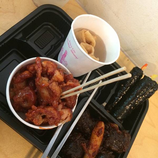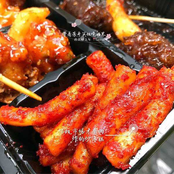 5000won(30块人民币)兑换10个铜板和一个饭盒。然后就可以在市场里挑吃的放在饭盒里了,放满之后可以再回这个二楼吃。基本上能用铜板换的小吃都是2个铜板,也会有三个铜板的时候,也有需要现金购买的吃吃。传统市场才有的炸辣炒年糕。虽然是炸的,但是不太油腻诶。