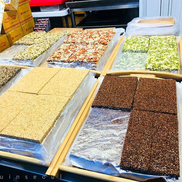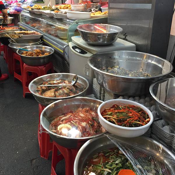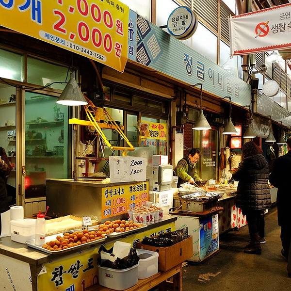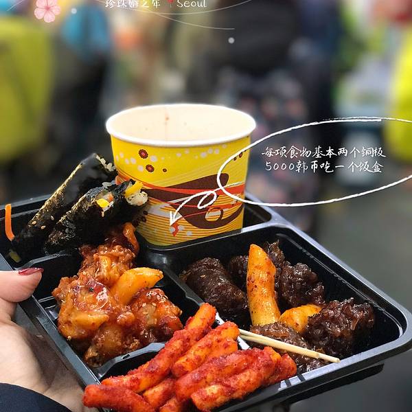 DAY3 上午 通仁市场 这个真是一个意外透了的行程,因为根本没有这个计划,由于二老想去看眼青瓦台。。。所以又来了景福宫附近,然后溜溜达达意外看到了这个因为RM知道的市场。在市场比较中间的地儿有个卫生间,边上是有个二层小楼,楼上就是兑换铜板的地方,同时也是食堂 5000won(30块人民币)兑换10个铜板和一个饭盒。然后就可以在市场里挑吃的放在饭盒里了,放满之后可以再回这个二楼吃。基本上能用铜板换的小吃都是2个铜板,也会有三个铜板的时候,也有需要现金购买的吃吃。传统市场才有的炸辣炒年糕。虽然是炸的,但是不太油腻诶。