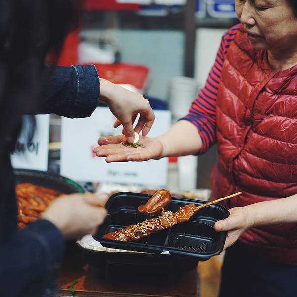 通仁市场的名气远不及广藏市场,但其实也是首尔的老字号。它与其他传统市场的最大区别就是规定客人要兑换铜钱以购买食物。实际上市场里很多商家都可以直接收现金,铜钱不过是一种情怀罢了。但既然来了自然是要体验一下的。