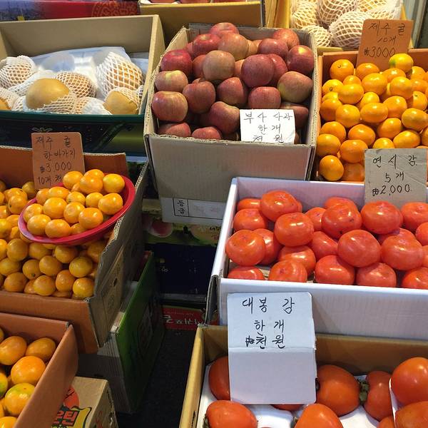 通仁市场最吸引人的就是”铜钱盒饭“了,铜钱在顾客中心二楼可以买到,在二楼和三楼的盒饭cafe都可以食用买来的盒饭。无限挑战有一期带外国人体验美食,就有来这里,和刘大神一起,羡慕啊!!在通仁市场的盒饭咖啡厅"通"内买上一定数额的铜板,然后拿着空饭盒去各家店,看到自己喜爱的,按照价格付铜板即可。遇到这种有钱币标志的店铺就可以使用~~~~哈哈好有意思啊!新鲜的水果,这红红的柿子和橘子,让人有食欲啊。韩国的水果好贵......通仁市场内有很多韩国特色美食,比如鸡蛋卷、炒年糕以及各式泡菜,还有很多韩式打糕,朋友们可以一一来品尝。最有人情味的地方莫过于市场,无限挑战中刘在石教外国游客一定要说“姨妈,多给一点”