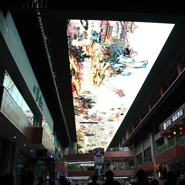 2.特色:秦汉唐的天幕不比北京世贸天阶差,会出现春夏秋冬四季的景色,非常的漂亮,吸引众多游客来这里拍照留念,特色之处是会有清明上河图的展出,这点十分难得,在天幕上可以看到清明上河图里走动的小人,活灵活现,十分生动。和世贸天阶的区别是这里的天幕没有用手机向天幕发短信的项目,可以使用在旁边的机器和天幕合影,这样以来我倒觉得这样的天幕的少了一些商业气息,多了一点文化的色彩。我个人认为这里的天幕比世贸天阶更好。
