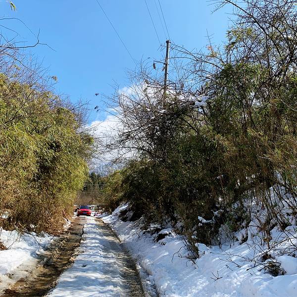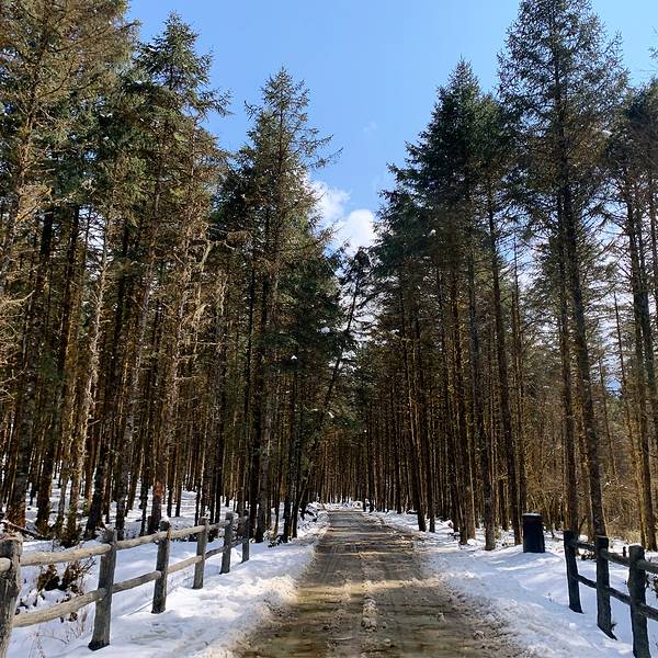 沿着台阶爬上了最顶端,眺望的景色。这是第一个觉得很惊艳的地方,原始森林,积雪点缀。公路上的绵羊🐑事先打了景区电话,景区免费,停车费💰10,来回观光车💰20,我们把车停在了这里公路上的绵羊🐑开了一半,有个红车,本来人家都退到后面去了,奈何老曾技术不过关,积雪太厚,车轮打滑,我们倒了回来🤣