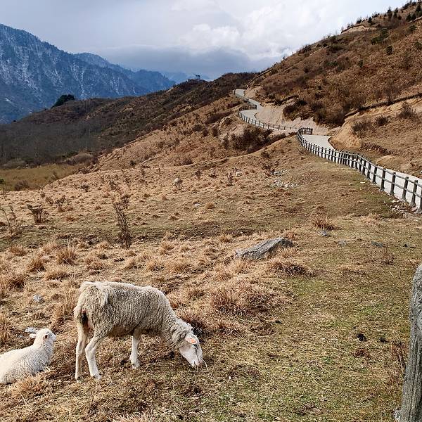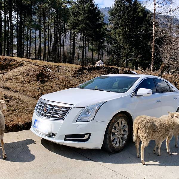 后...事先打了景区电话,景区免费,停车费💰10,来回观光车💰20,我们把车停在了这里公路上的绵羊🐑开了一半,有个红车,本来人家都退到后面去了,奈何老曾技术不过关,积雪太厚,车轮打滑,我们倒了回来🤣