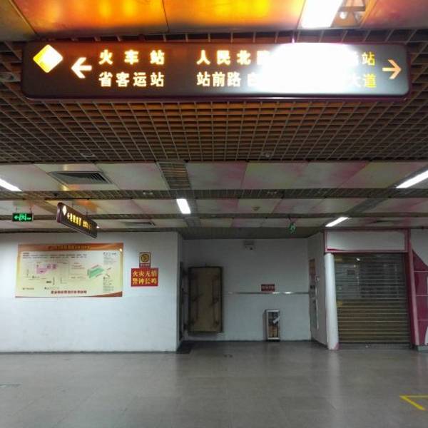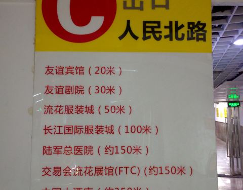 这个C出口,指示标记也不是很清晰,从友谊剧院往火车站走的话,在人行天桥底,有一个地下通道的入口,就是C口,该口子顶上红底黄字的招牌写着“地中海聚宝商业城”,从这里进去沿着通道原路返回就可以到地铁了。