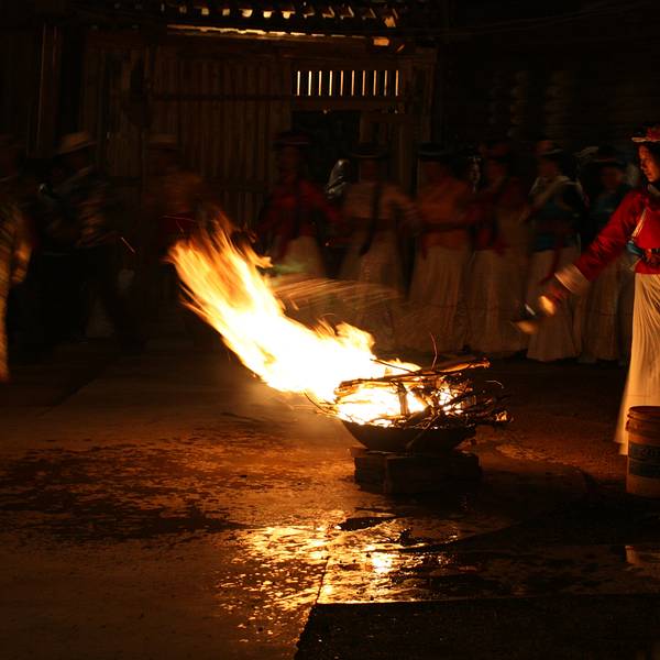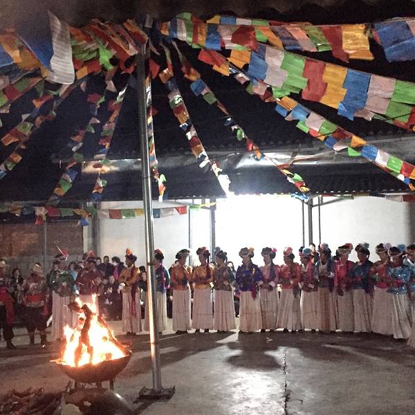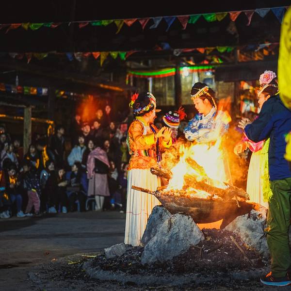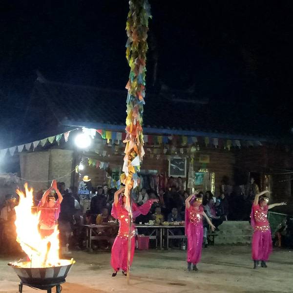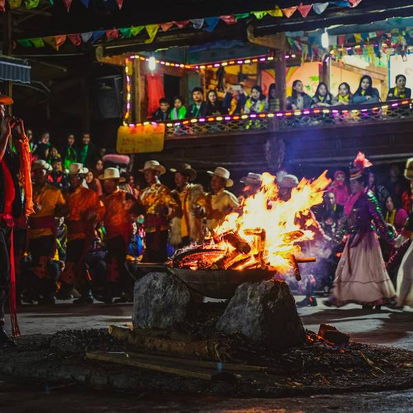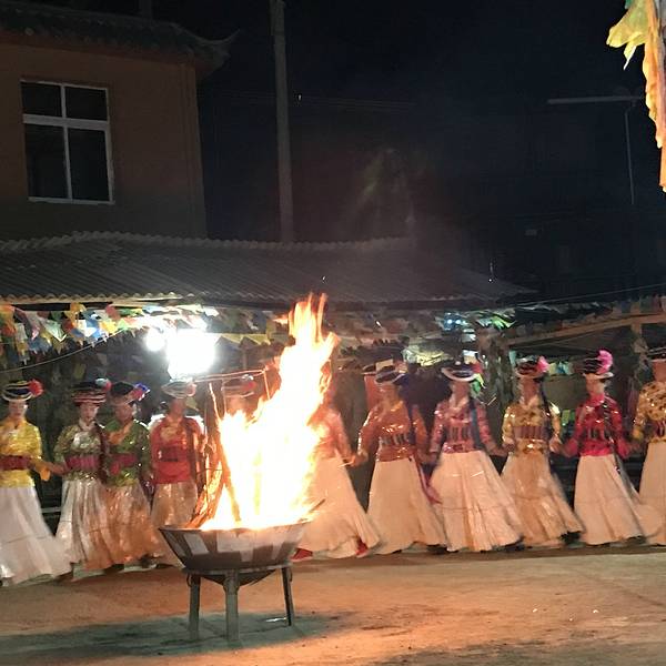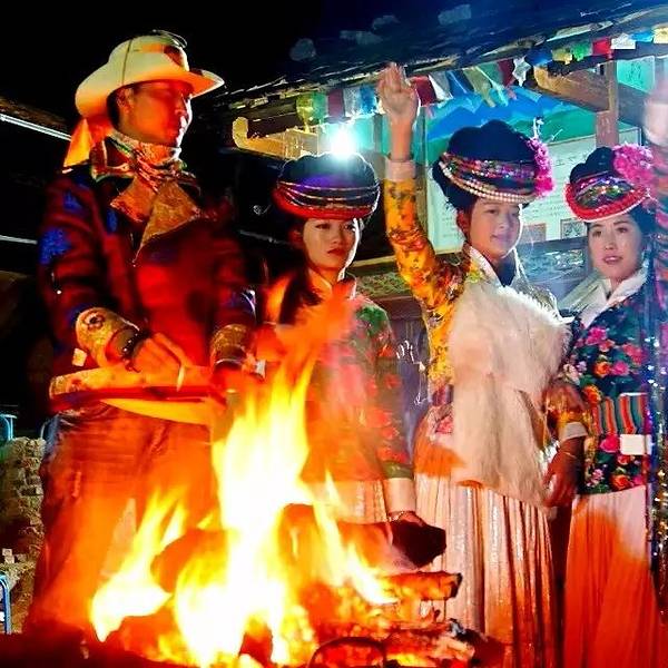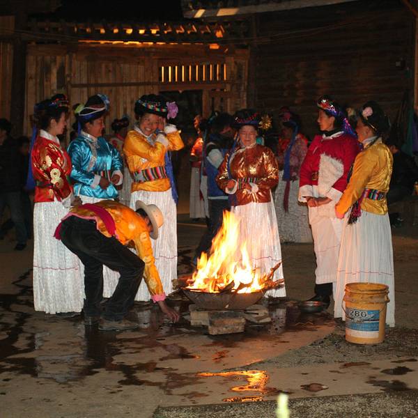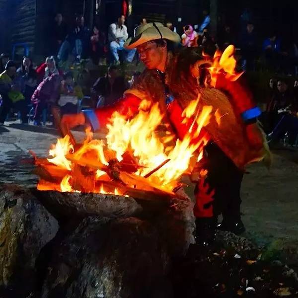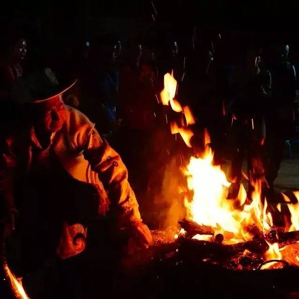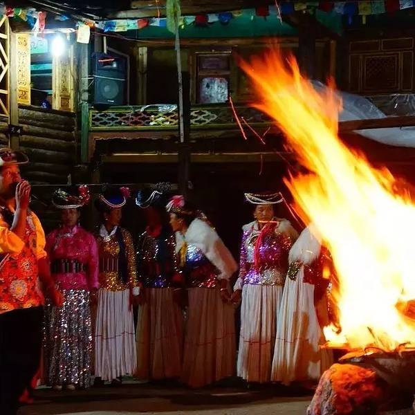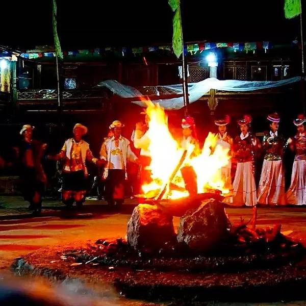 据传,古时候摩梭人为防外敌侵袭,部落首领组织族众在村口烧起一堆大火,人们围着火塘呐喊跺脚。敌人退兵后,众人欣喜若狂,围着火堆通宵达旦的唱歌跳舞,最后产生了群体娱乐性的锅庄舞。篝火晚会无论男女老少都会上场,带动你的情绪,超级热闹!身处其中,感受到摩梭族人们的激情和欢快。泸沽湖附近村寨中可以参加的篝火晚会,时长一个小时,开始是一群男女青年穿着民族服装围着篝火变换各种步伐跳着,20分钟后邀请全体观众围两个大圈跳20分钟。最后一段时间是对歌,由他们开始唱,然后观众上前献歌。