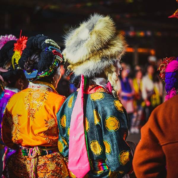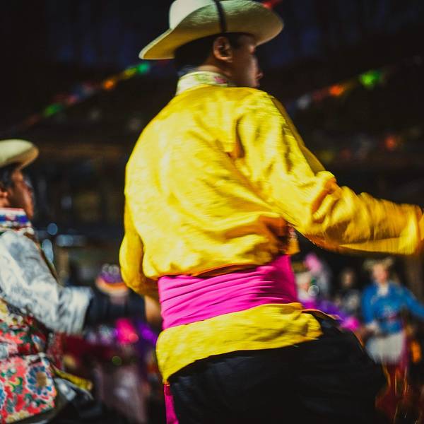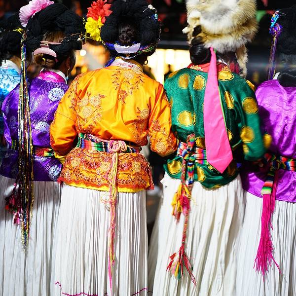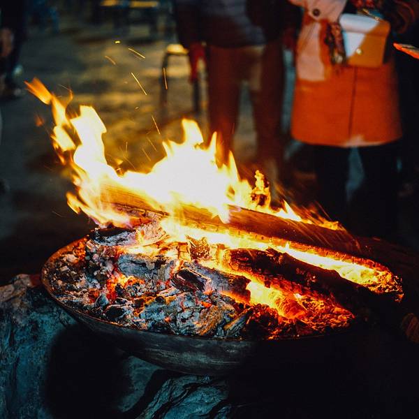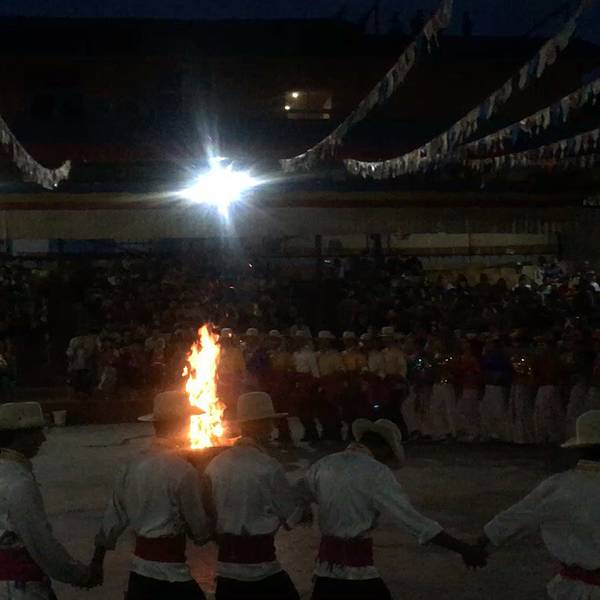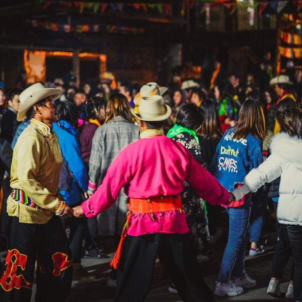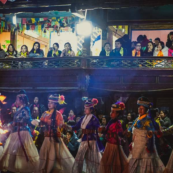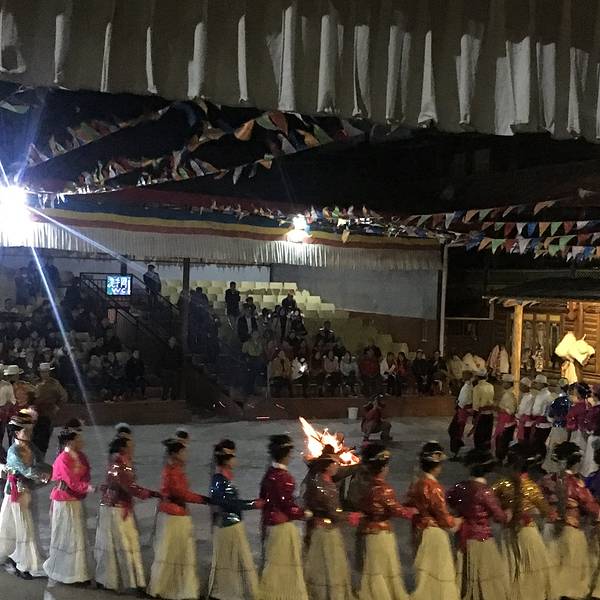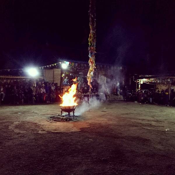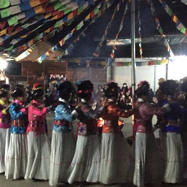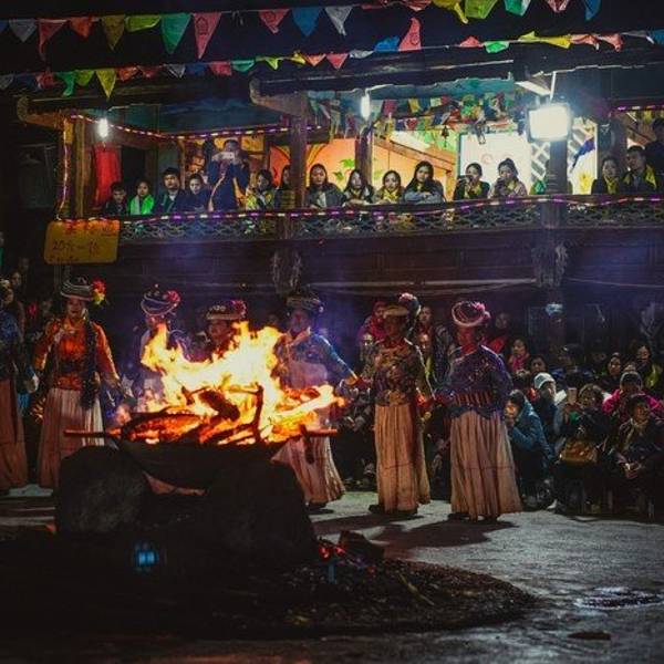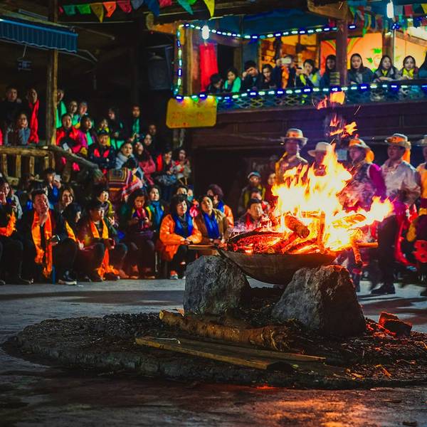 据传,古时候摩梭人为防外敌侵袭,部落首领组织族众在村口烧起一堆大火,人们围着火塘呐喊跺脚。敌人退兵后,众人欣喜若狂,围着火堆通宵达旦的唱歌跳舞,最后产生了群体娱乐性的锅庄舞。篝火晚会无论男女老少都会上场,带动你的情绪,超级热闹!身处其中,感受到摩梭族人们的激情和欢快。泸沽湖附近村寨中可以参加的篝火晚会,时长一个小时,开始是一群男女青年穿着民族服装围着篝火变换各种步伐跳着,20分钟后邀请全体观众围两个大圈跳20分钟。最后一段时间是对歌,由他们开始唱,然后观众上前献歌。