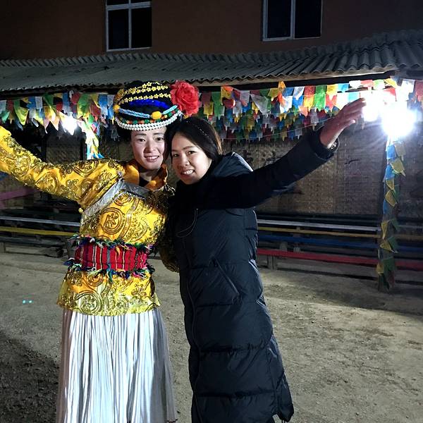 吃到一半便被告知篝火晚会准备开始了,我们就赶紧随便扒多几口就过去篝火晚会了。据说大落水的篝火晚会是外包给外面的表演人员表演的,里格这边的篝火晚会是自己摩梭族族人每家派出一人轮流表演的。一进去我们就看到了十多位阿哥阿妹在篝火旁暖身。后来小玲还兴冲冲下去一起跳舞,我和老赵在隔壁给她录视频。接下来的是对歌环节,我和小玲想,来都来了,不上去对下歌就可惜了,然后就兴冲冲举手上去对歌唱了《海阔天空》。老赵就在下面帮我们录视频纪念哈哈哈哈。阿哥阿妹们还有一个奖励,就是一堆阿哥冲出来吧我们抛到空中,唱完一转头十几个阿哥冲出来把我吓到转头就跑,结果还是被抓回去丢上天了,那个感觉是真的很刺激。下来之后老赵和我说,就我是被抛得比其他人都高了,我感觉自己都上天了真是。篝火晚会结束后还听到了有人在唱《喜欢你》。