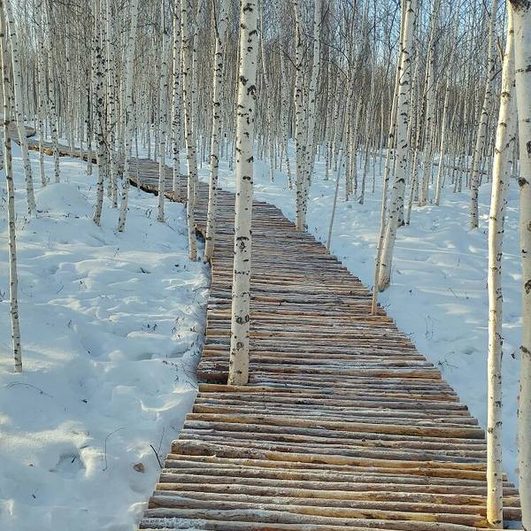 真正置身这一片白桦中,抬头看蓝色的天空,细梢挑起丝丝阳光,脚下木头栈道,白色的雪闪着碎宝石的光...我们首先去了白桦林。听过无数遍的白桦,阳光中,冰雪中,永远一副向上的傲然。真正置身这一片白桦中,抬头看蓝色的天空,细梢挑起丝丝阳光,脚下木头栈道,白色的雪闪着碎宝石的光彩,仔细一看,连树皮都发光。