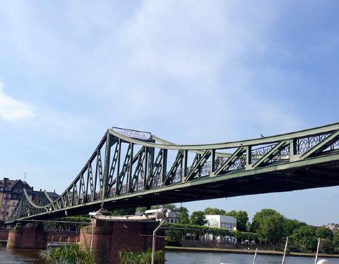美因河是莱茵河的支流,也是法兰克福的母亲河,河水波光粼粼,映衬着河两岸的茵茵绿色和座座长桥,其中最有名的铁桥上有很多同心锁。河的南岸是老城区,北岸是新区,也是博物馆区。美因河上有很多游轮,天气好的时候坐游轮欣赏两岸风景也是很惬意的事情。