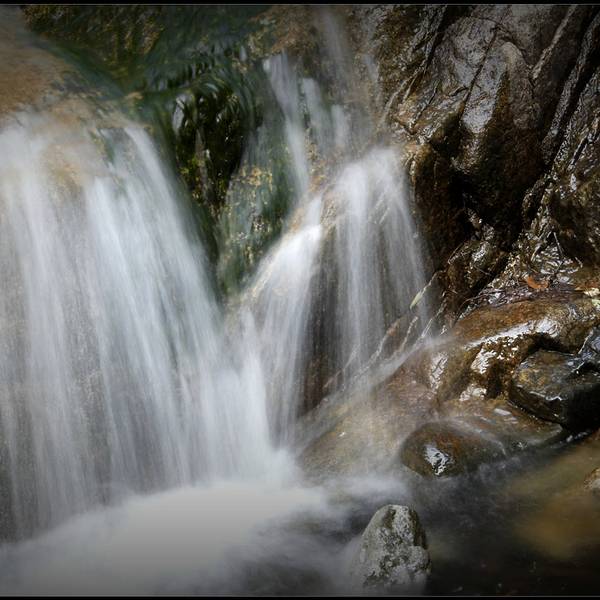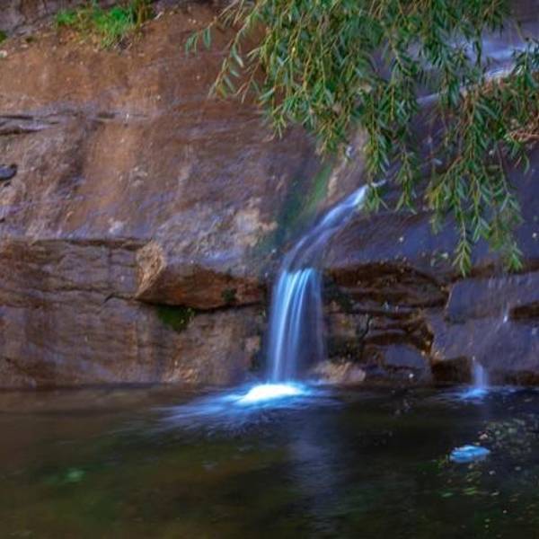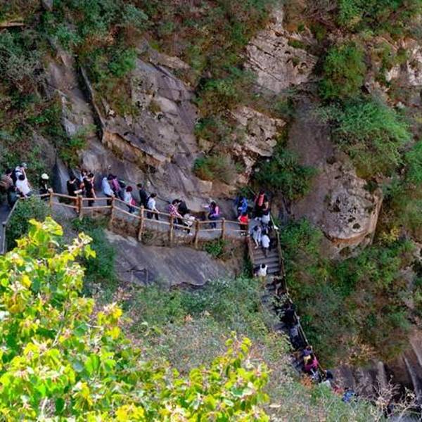 一个平台休息区,一束阳光从山顶尖直射而下,洒满大半个峡谷,似乎又到了另外一个世界……大瀑布的豪壮,与小溪的柔情,都是大自然的杰作……手持拍瀑布,确实困难重重,特别是在有风及强光对比下……人群总是集中在有潭水的地方。大家灿烂的表情。十月深秋,水量已很小了,但串串溪流,映衬峡谷,倒也惬意。三嫂素颜照。胜境清凉。只是小溪已接近干涸。双龙瀑