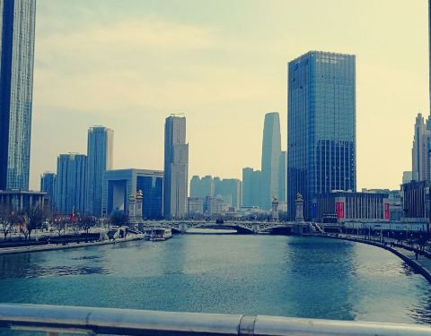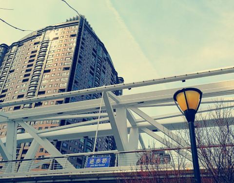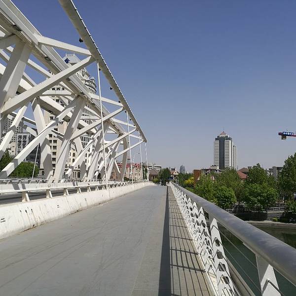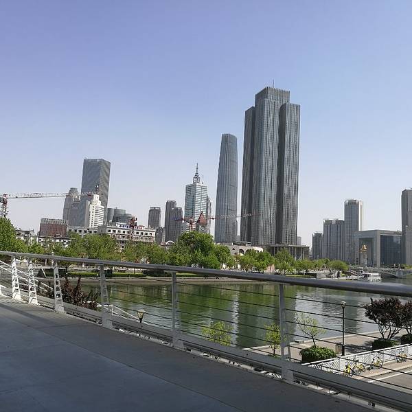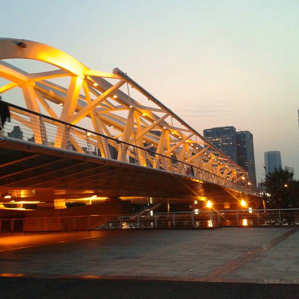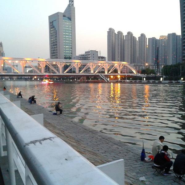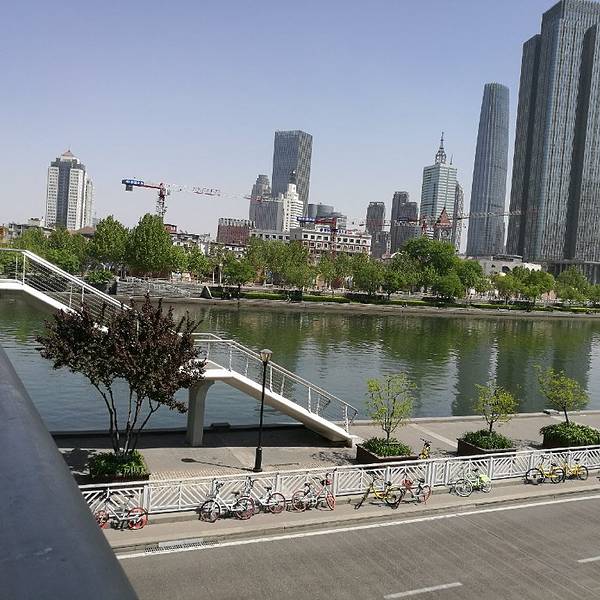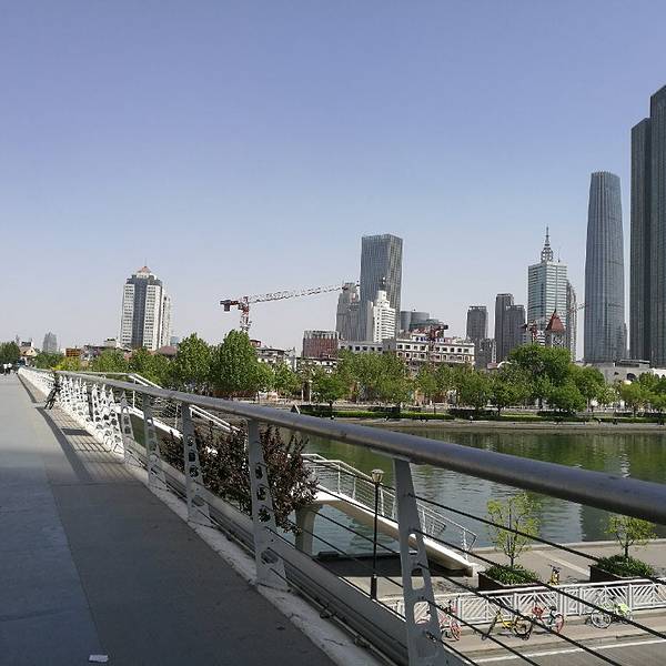 通南桥。天津人民管它叫“和谐号”。一头连接的是奥匈建筑群。