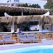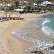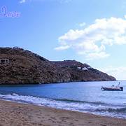 渡船行约40分钟抵达第三个停靠点超级天堂海滩,我们在这里下船,因为没有码头,小船就近停泊,我们则必须拖鞋光脚下水,因此也就就在无意间被迫与希腊爱琴海来了个亲密接触。海水不算凉,但下海游玩的人还是稀少...渡船行约40分钟抵达第三个停靠点超级天堂海滩,我们在这里下船,因为没有码头,小船就近停泊,我们则必须拖鞋光脚下水,因此也就就在无意间被迫与希腊爱琴海来了个亲密接触。海水不算凉,但下海游玩的人还是稀少,大多数都是在付费在沙滩椅上晒太阳,也有不少不用出钱在沙滩上铺上自己带的毯子的游客,同样享受免费的日光浴。我们沿着海滩走了半程,后面沙滩的沙子比较粗,我们就上岸晒干脚后穿鞋继续游览。这个海滩也不大,但比较深入在一个海湾中,因此海湾中的海面比较平静。岸边有几家餐厅布置的很有特色,有的居高临下虽没有沙滩,但也是风光无限。 因为从超级天堂海滩返回的小船最早一班是下午两点,因此我们有三个小时的时间在这里休闲,于是在转了一遍海滩后,我们在位于端头的一家酒吧落座。花费6欧元购买一杯咖啡和一杯热茶,主要是为了能在位于高处的沙发椅上休息观赏海滩风光。如此悠闲奢侈的旅游项目在我们以往的记录中还不多见,其实应该尽快适应这样的慢节奏旅游生活,旅游其实不仅是看景点风光,在大自然的风光中放松自己也很有必要。这个酒吧的位置很好,但服务实在不怎么样,袋泡茶只给一杯开水,不能再续开水,所谓的希腊咖啡好像都是咖啡渣非常浑浊。好在我们的目的也就是要他们的座位休息。