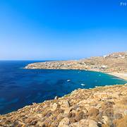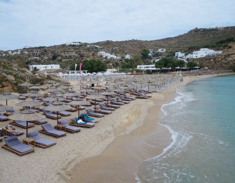 渡船行约40分钟抵达第三个停靠点超级天堂海滩,我们在这里下船,因为没有码头,小船就近停泊,我们则必须拖鞋光脚下水,因此也就就在无意间被迫与希腊爱琴海来了个亲密接触。海水不算凉,但下海游玩的人还是稀少,大多数都是在付费在沙滩椅上晒太阳,也有不少不用出钱在沙滩上铺上自己带的毯子的游客,同样享受免费的日光浴。我们沿着海滩走了半程,后面沙滩的沙子比较粗,我们就上岸晒干脚后穿鞋继续游览。这个海滩也不大,但比较深入在一个海湾中,因此海湾中的海面比较平静。岸边有几家餐厅布置的很有特色,有的居高临下虽没有沙滩,但也是风光无限。 因为从超级天堂海滩返回的小船最早一班是下午两点,因此我们有三个小时的时间在这里休闲,于是在转了一遍海滩后,我们在位于端头的一家酒吧落座。花费6欧元购买一杯咖啡和一杯热茶,主要是为了能在位于高处的沙发椅上休息观赏海滩风光。如此悠闲奢侈的旅游项目在我们以往的记录中还不多见,其实应该尽快适应这样的慢节奏旅游生活,旅游其实不仅是看景点风光,在大自然的风光中放松自己也很有必要。这个酒吧的位置很好,但服务实在不怎么样,袋泡茶只给一杯开水,不能再续开水,所谓的希腊咖啡好像都是咖啡渣非常浑浊。好在我们的目的也就是要他们的座位休息。