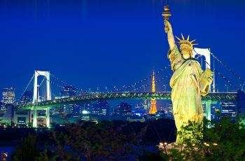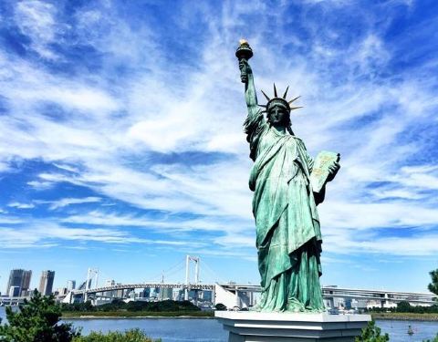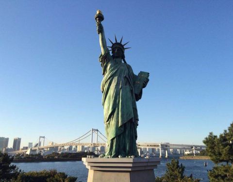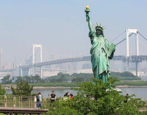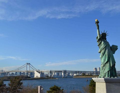 东京的台场海滨公园内,有一座高大的自由女神像,从底座算起,高度约有12.25公尺,重约9吨,由铁和青铜制成,金叶环绕着象征自由的火炬。这座自由女神像为世界上第三座“自由女神像”,是法国政府公认的复制品。 为了配合东京“法国文化年”活动,巴黎曾把自己的女神像借给东京以供展出,1998年4月起的1年间,巴黎的自由女神像便搬到了台场海滨公园内,前来观看的游客络绎不绝。于是东京人决定把它永远留在台场,便复制了该座雕像。 自由女神像矗立在海边,背倚东京湾和彩虹大桥,这与美国的自由女神像周围的景致也很相像,很容易产生“身在纽约”的错觉。不少游客前来,都会以彩虹大桥为背景,和自由女神像一起合影留念。