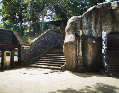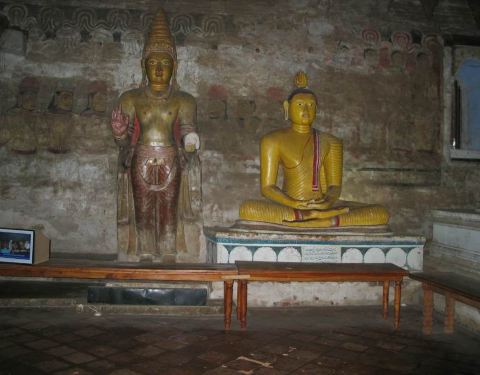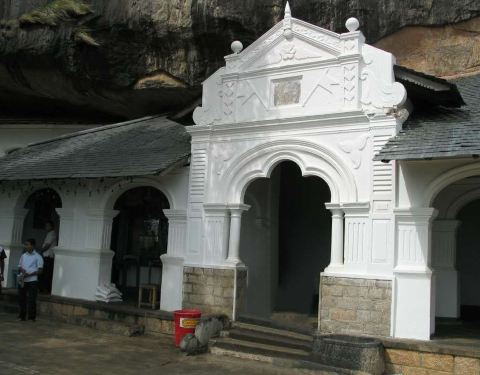 丹布勒石窟是斯里兰卡有名的佛教寺窟,建于公元前1世纪,坐落于一座石山的斜坡上,珍藏着面积达2100平方米的用树汁等原料绘制而成的壁画与157尊雕像,具有很高的宗教艺术价值。