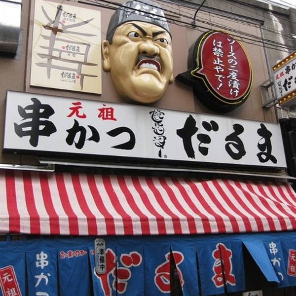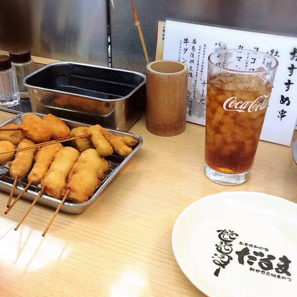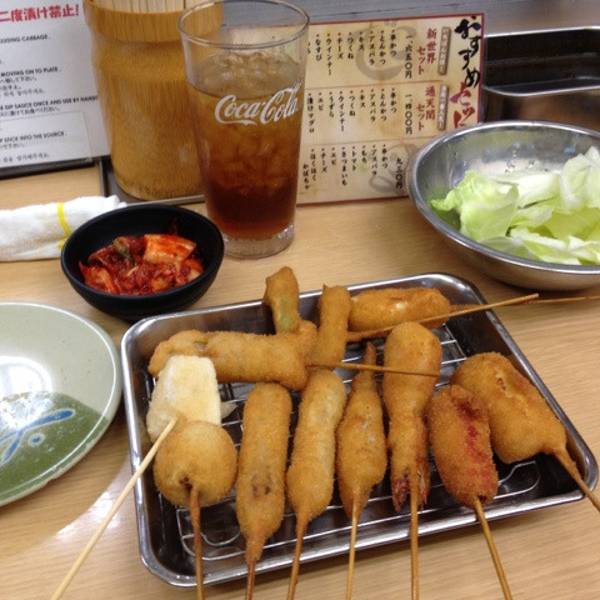 源于英文的“Cutlet”(带骨肉),是明治时期传入日本的食品,后被改良后形成了今天以猪肉为主料的样子。除了猪肉之外还有各种肉类鱼类海鲜甚至蔬菜的吃法。大阪的炸肉串外衣很薄,因此一次吃很多也不会油腻。而且在大阪,吃Kushi-katsu有一个老规矩叫“酱不能沾两次(2度渍け禁止)”,因为入味用的蘸酱是放在较大的缸子里共享的,所以吃串时先蘸酱,下嘴之后因为卫生问题就不能再蘸了。 不倒翁这家店就位于大阪必去景点通天阁脚下,非常好找,交通非常方便。