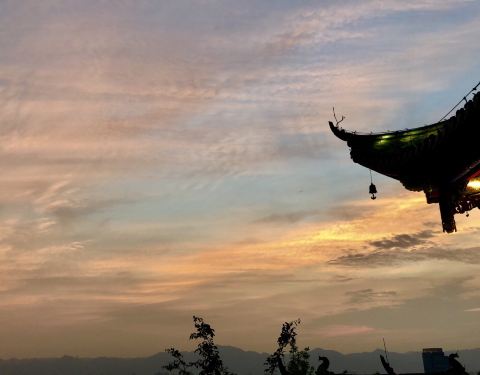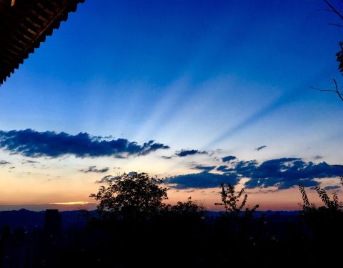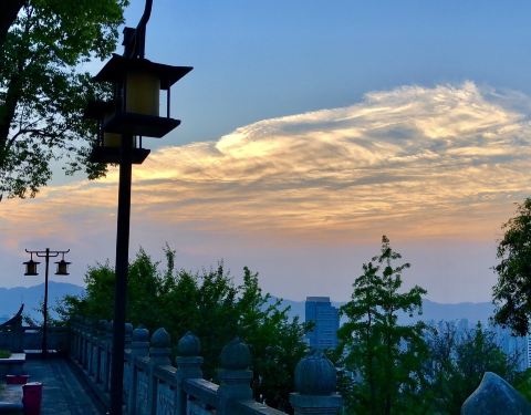 鸿恩寺公园的仲夏,风轻柔,夜清幽。晚霞越来越红,几道金光穿透云层,洒在远处的山峰上,绚烂如烟花。