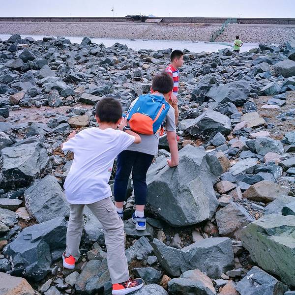 10.1一大早,凡童鞋就催着出门,同时也怕堵路上,12:30的船,8:30就出门了,一路畅通从S20到S2,再过东海大桥,9:40到达沈家湾码头。车子停码头边上的停车场,48元上限/每天。由于订的套餐儿童票要自己买(让我们直接上船补票),为了安全起见,先去售票大厅询问了一下,答复的确是直接上船买,总算放下心。10:30左右,三兄弟高兴地成功汇合,然后去码头边上的石滩探险去了。黄拉拉的海水,配合着蓝天白云,虽说观赏度不佳,但好歹比城市的钢筋水泥来的让人心旷神怡些。