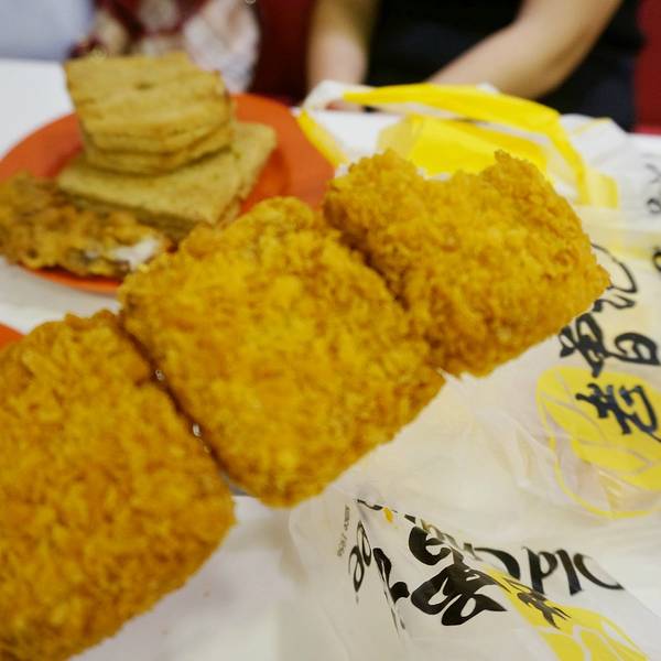 不过我和妈妈是六点多来到武吉士附近的一家店,在旁边的老曾记买了炸螃蟹肉、炸鱿鱼、炸虾和咖喱饺子带过来一起吃,坐下来买了份no cheese的烤土司,还有另一份是什么名字我忘了,店员推荐的,这里的店员好热心,总之是热卖品,还挺好吃呢。