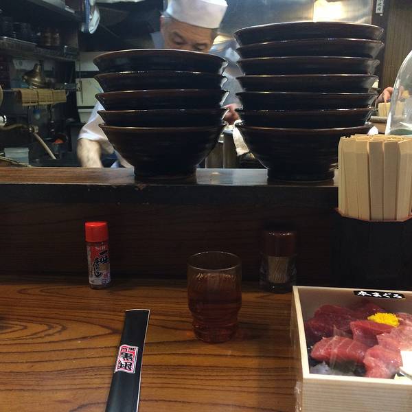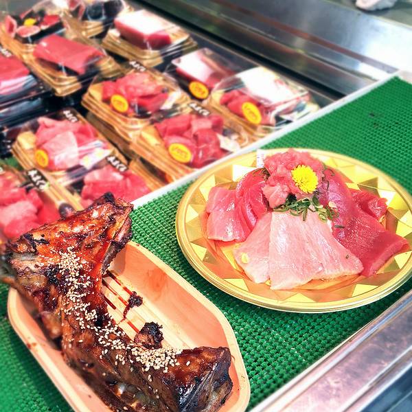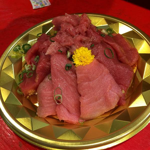 草草逛了一下市场后赶紧奔向我们此行的目的地“黑银金枪鱼”!!这家店的老板是个大胖子,传说刀工了得,可惜只见身影,不见其功~那也没办法,可能是因为我们来的太晚了吧,估计他只有一大早才会亲子动刀吧~ 虽然是很小的门店,但是生意非常的好,在黑门市场里卖金枪鱼的有很多家,但是数他们家生意最好,好在我们去的时候不是饭点,没有多少人在排队,还在店铺的旁边找到了吧台坐,愉快的品尝着美味的金枪鱼刺身,我们先买了一份拼盘+烤金枪鱼下巴~~吃完后发现不过瘾于是又来了一份纯的金枪刺身和烤下巴~~哈哈哈~~酒足饭饱~~~口味么~~去尝尝就知道啦~~~嘻嘻!!!