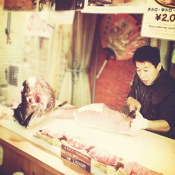 但是生意非常的好,在黑门市场里卖金枪鱼的有很多家,但是数他们家生意最好,好在我们去的时候不是饭...