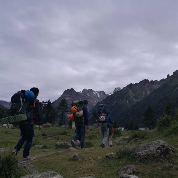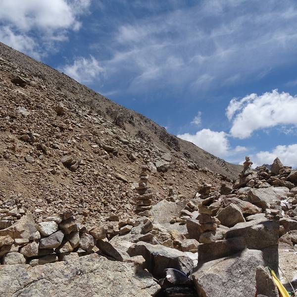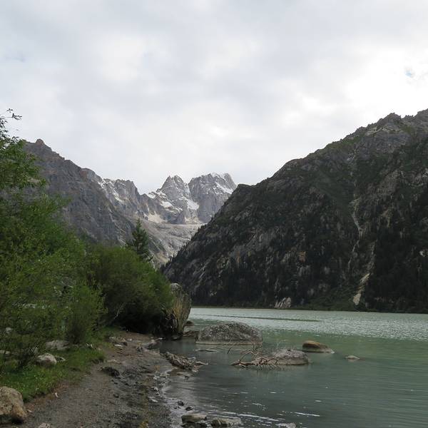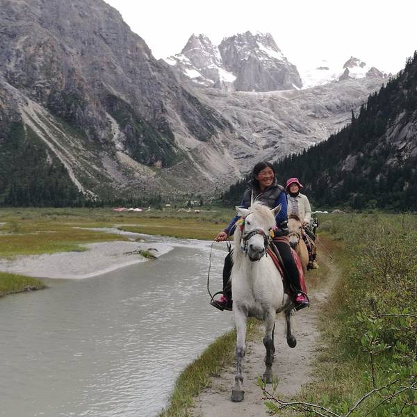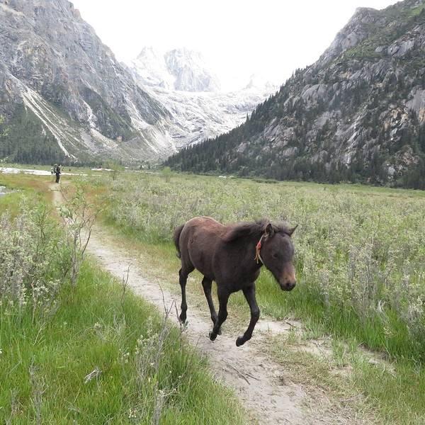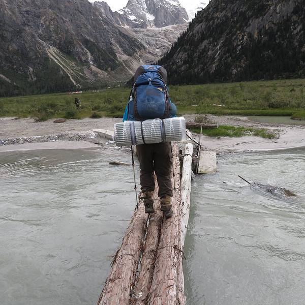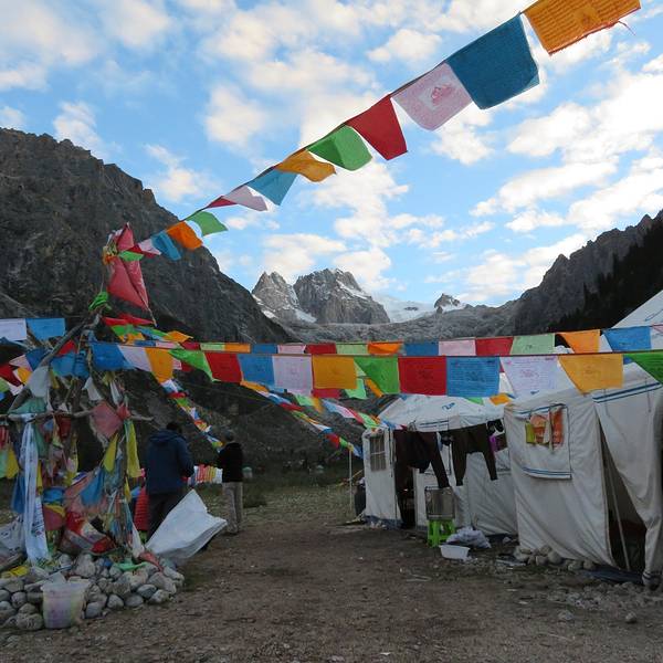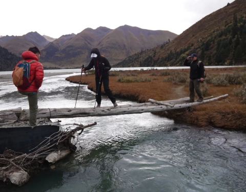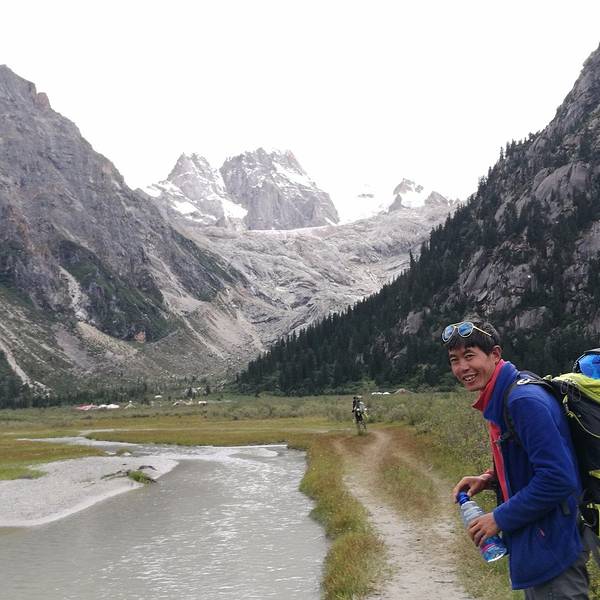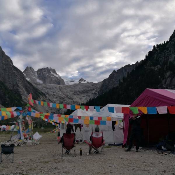 这一切,便是从我开始进入雀儿山无数次重复想象的。我们沿着湖前进,还好水没有涨,有时水会把沿湖的路给淹掉。大本营很远便可以看到,雀儿山也越来越清晰了。最后走到一片小平原的河滩,穿过去便是大本营了。这个独木桥,看似简陋,但在水涨的时候几乎是通过这里的唯一办法。别看这知识区区几根木头,不过定是费了不少人力,给我们这些远道而来的“客人”,提供了极大的方便。这里要提一下雀儿山对“当地藏民的保护政策”。凡是入山爬山者,景区门口一般都必须得请藏民马夫运送物资到大本营,这个钱是有向导登山公司支付的,具体多少并不清楚,而后从大本营到C1营地,则必须请背负夫,上去一次300,下来一次300,这个也是强制的。关于这个情况比较常见,我所持的态度是可以理解,毕竟我们来此登山确实是一定程度影响了当地的生态环境,而且在中国境内登山基本上不需要很严格的环保手续,另外作为当地藏民的经济来源的确有限,就算支持环保工作和门票了吧。